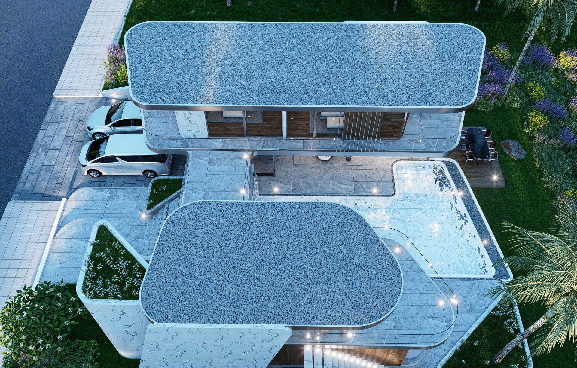 The exterior design features natural stone, marble, and concrete finishes combined with lush tropical landscaping. A private 4×15-meter swimming pool, waterfall fountain, and multiple terraces ensure both privacy and style. With layouts ranging from 449 sqm to over 616 sqm, the villas provide ample living space and parking for 2 to 3 cars.