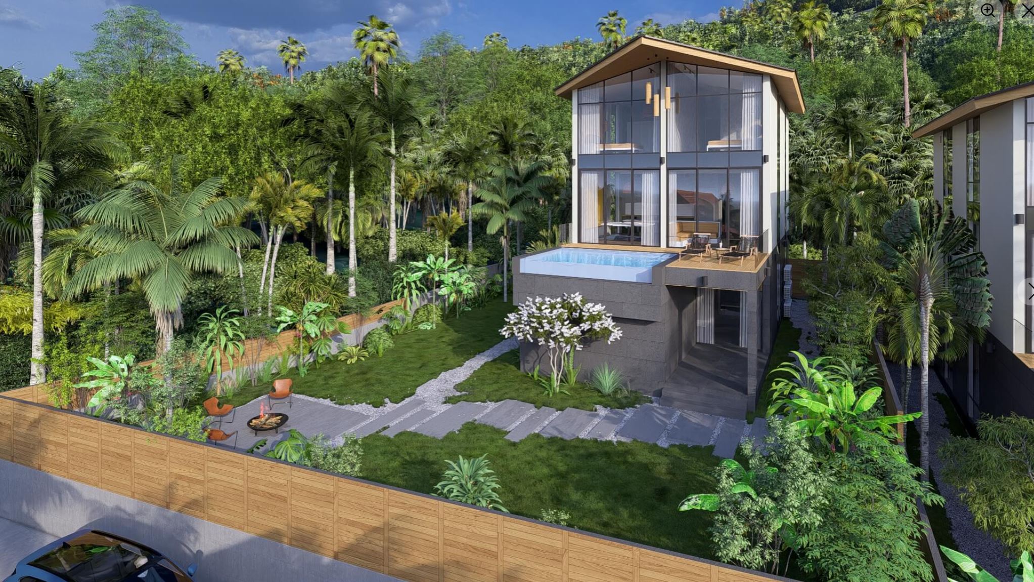 A private swimming pool framed by a spacious landscaped garden, offering total privacy and a true tropical resort feel.