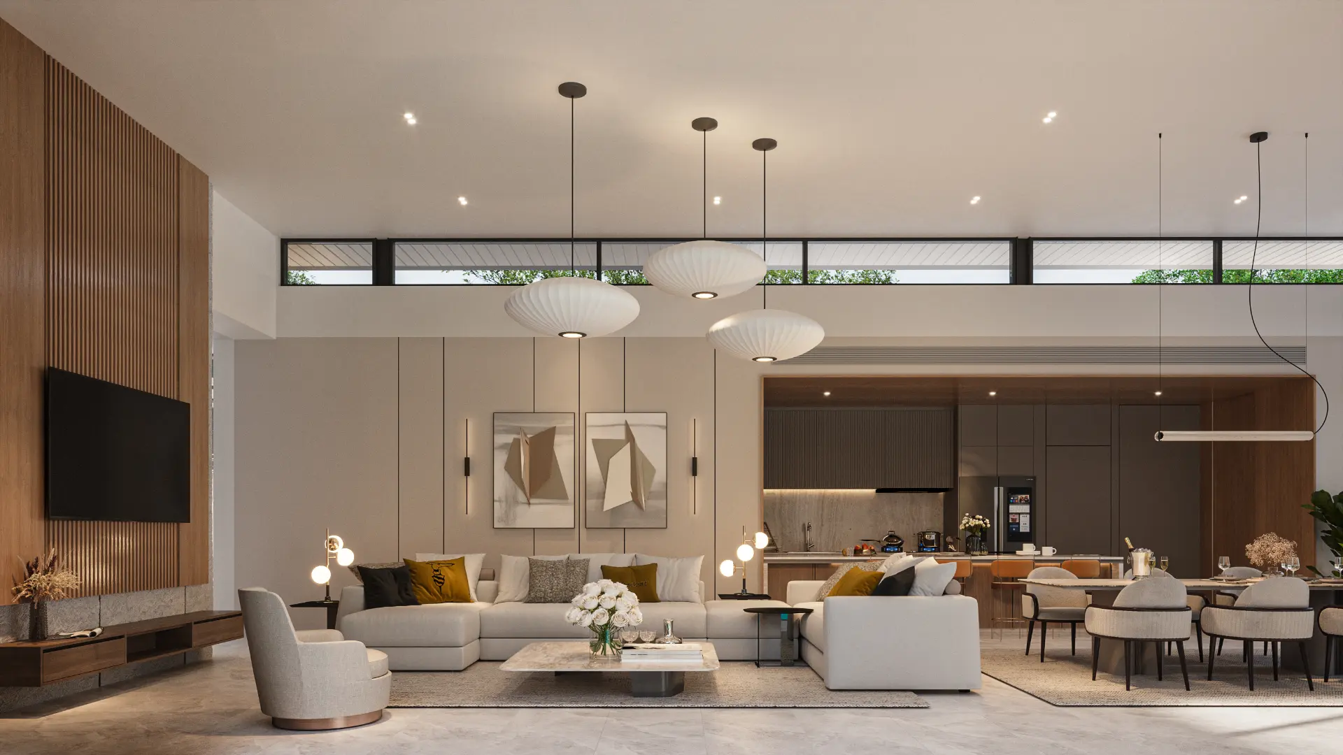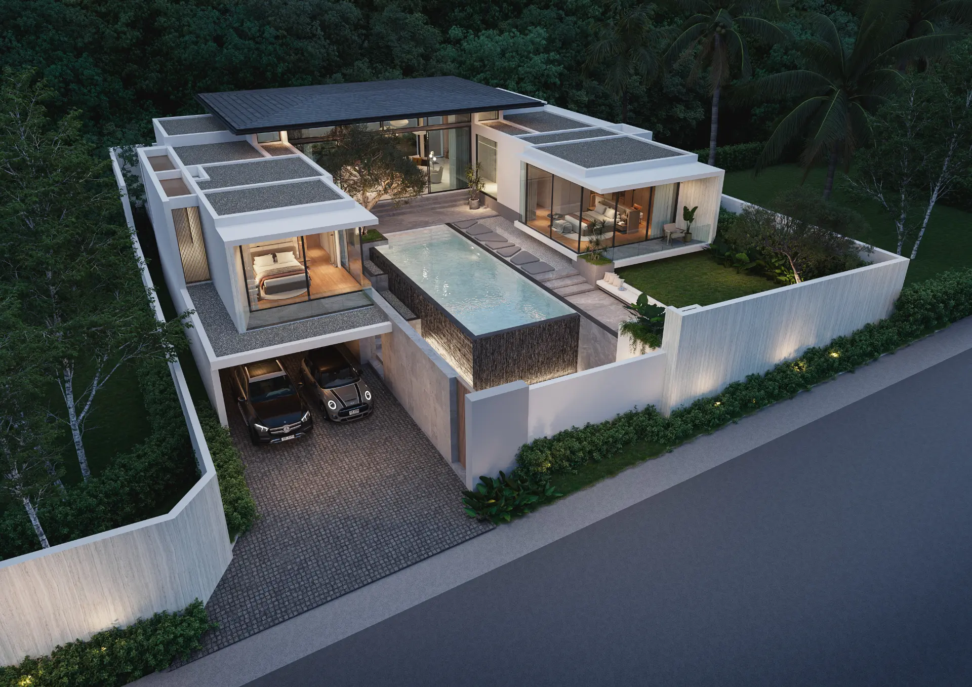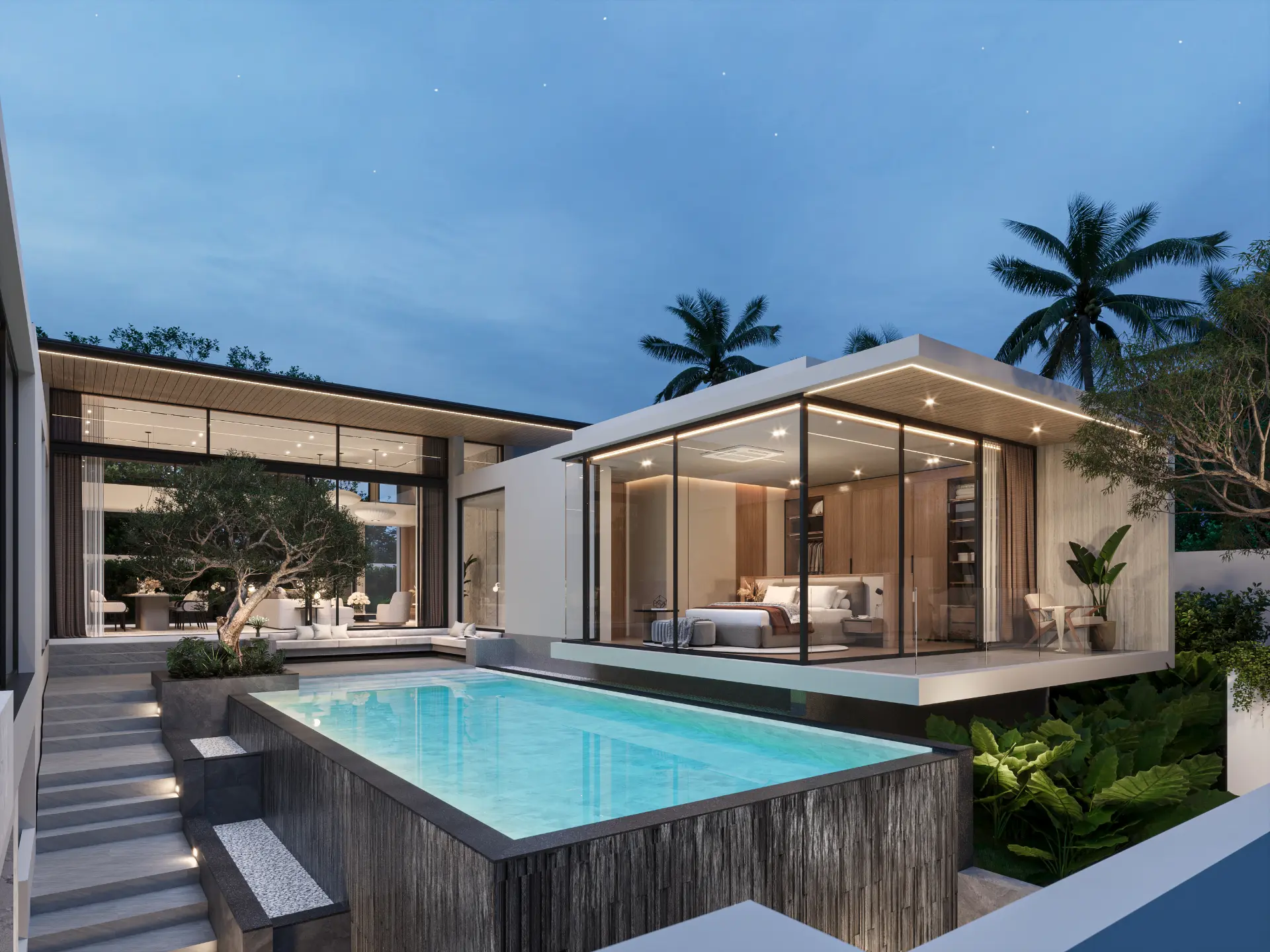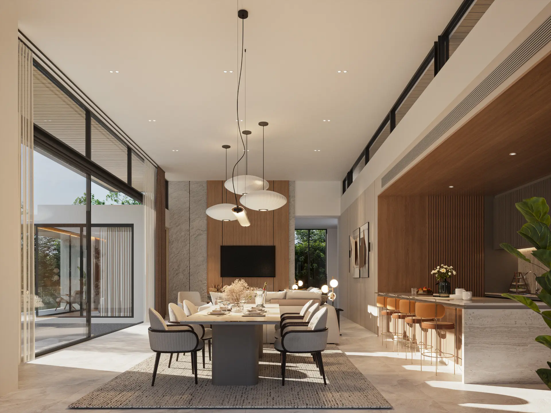 Large glass panels and open layouts bring abundant natural light indoors, while high ceilings and clean architectural lines enhance the feeling of spaciousness. The balance between privacy and openness ensures that each villa becomes a personal retreat while remaining connected to its surroundings.