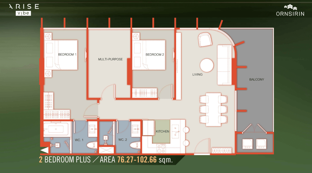 This unit type combines the best features of a spacious two-bedroom layout with an additional flex room—ideal for a home office, media room, guest room, or playroom. With thoughtful interiors, premium furnishings, and access to over 30 lifestyle-enhancing amenities, Arise Vibe – 2BR Plus truly embodies the future of Phuket real estate.
