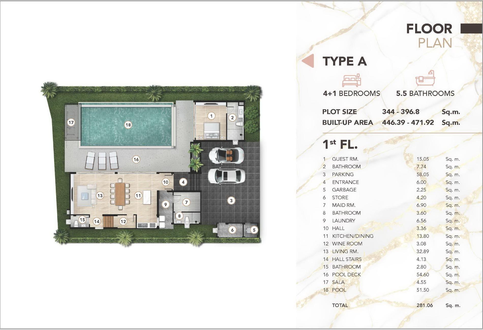 With a plot size ranging from 344 to 496.8 sq.m. and a built-up area of 446.39 to 471.92 sq.m., Type A offers ample space for luxurious family life. The villa features 4+1 bedrooms, including double master suites, and 5.5 bathrooms, providing generous living quarters for family members and guests alike.