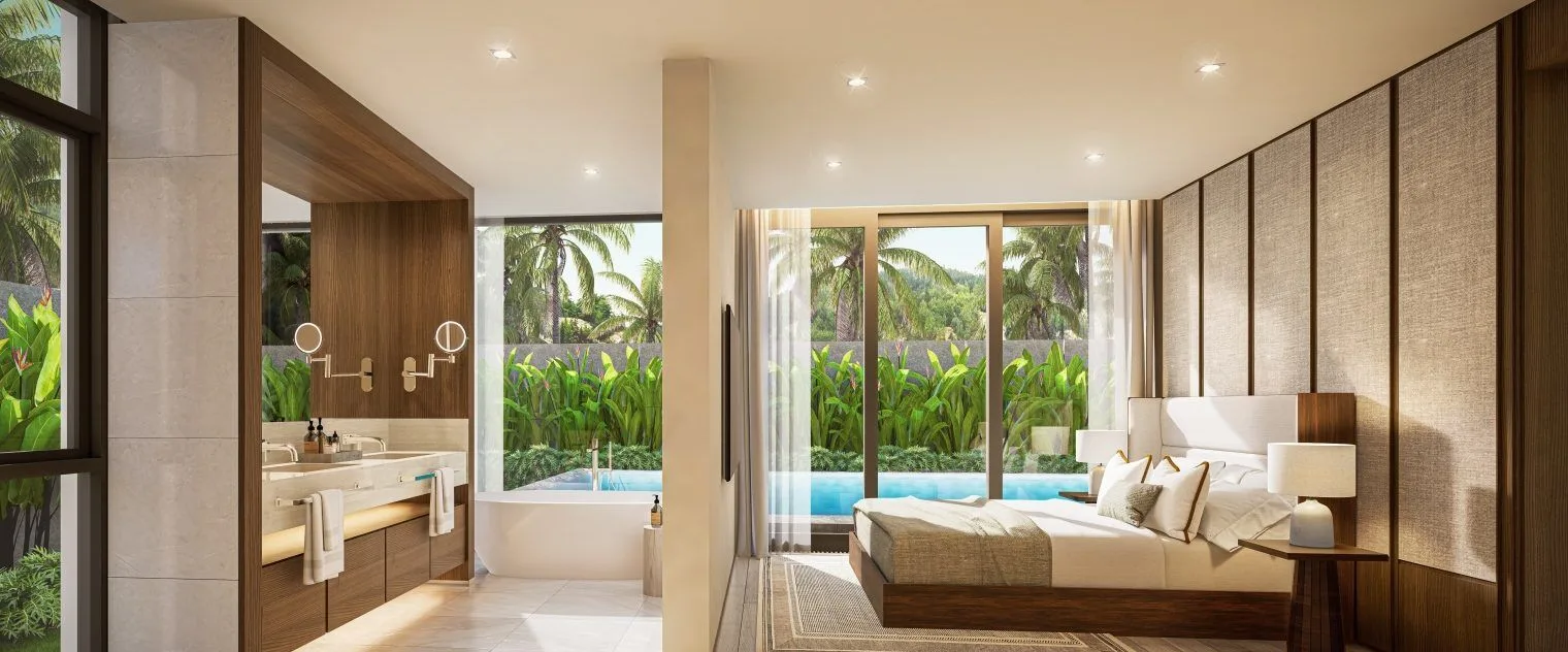 Each villa is thoughtfully designed to combine indoor and outdoor living, featuring large glass doors and windows that allow for natural light to permeate the interior. Open-plan layouts, elegant finishes, and high ceilings contribute to a modern, airy ambiance. Each villa also includes a private pool, which is surrounded by a lush landscape that enhances privacy while providing a tranquil, tropical setting.