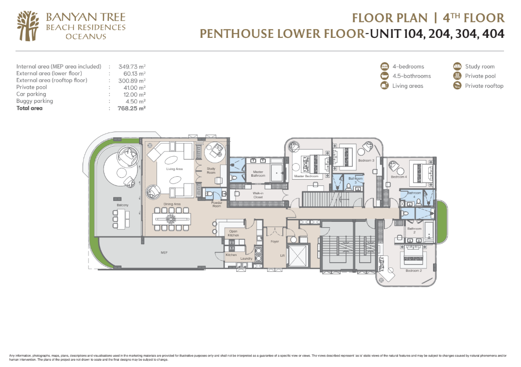 The 4BR penthouse at Banyan Tree Beach Residences Oceanus spans a total of 768 m², offering an extraordinary amount of space both indoors and outdoors. Designed to maximize light, space, and airflow, this penthouse features high ceilings, floor-to-ceiling windows, and seamless transitions between indoor living areas and expansive terraces.