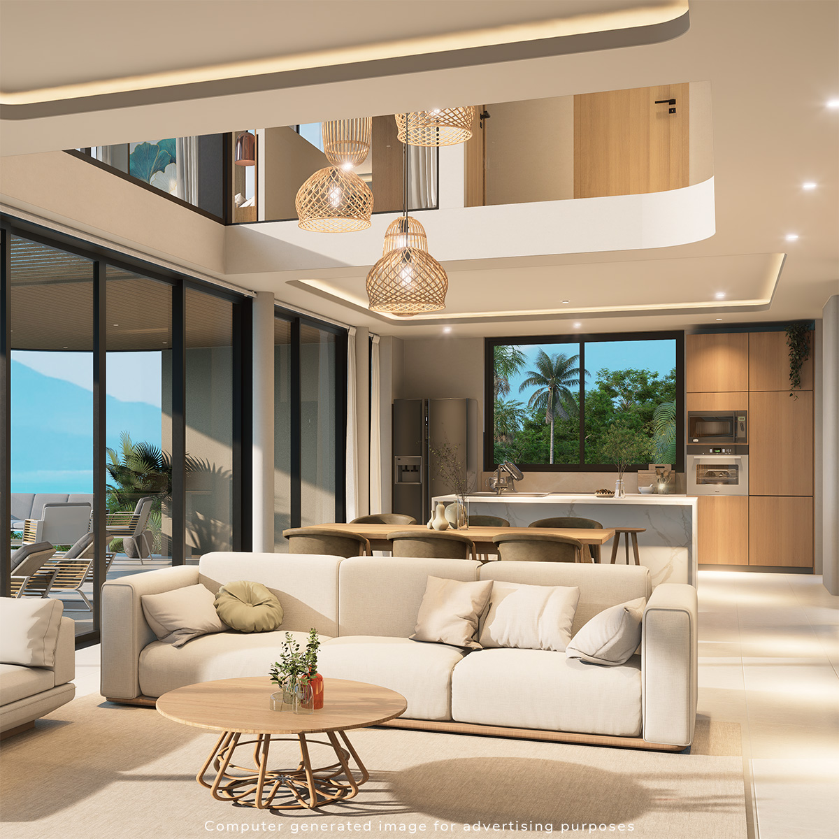 The villas offer flexible layouts, comprising 3 to 4 spacious bedrooms and 4 to 5 elegantly designed bathrooms, ensuring comfort and privacy for all residents and guests. Each bedroom is thoughtfully crafted to provide a serene retreat, complete with modern furnishings and decor that reflect the island’s natural beauty.