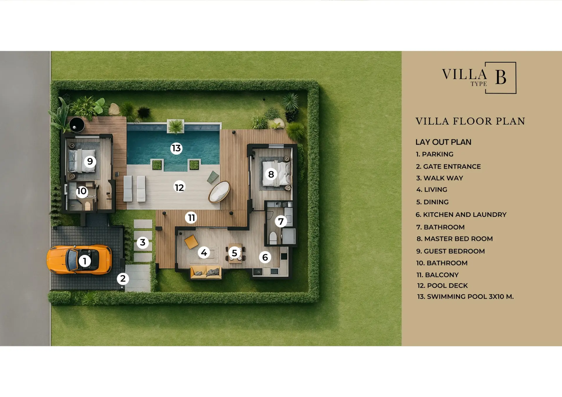Villa B balances indoor functionality with generous outdoor areas, including shaded terraces and landscaped gardens, creating a home that feels both intimate and open.