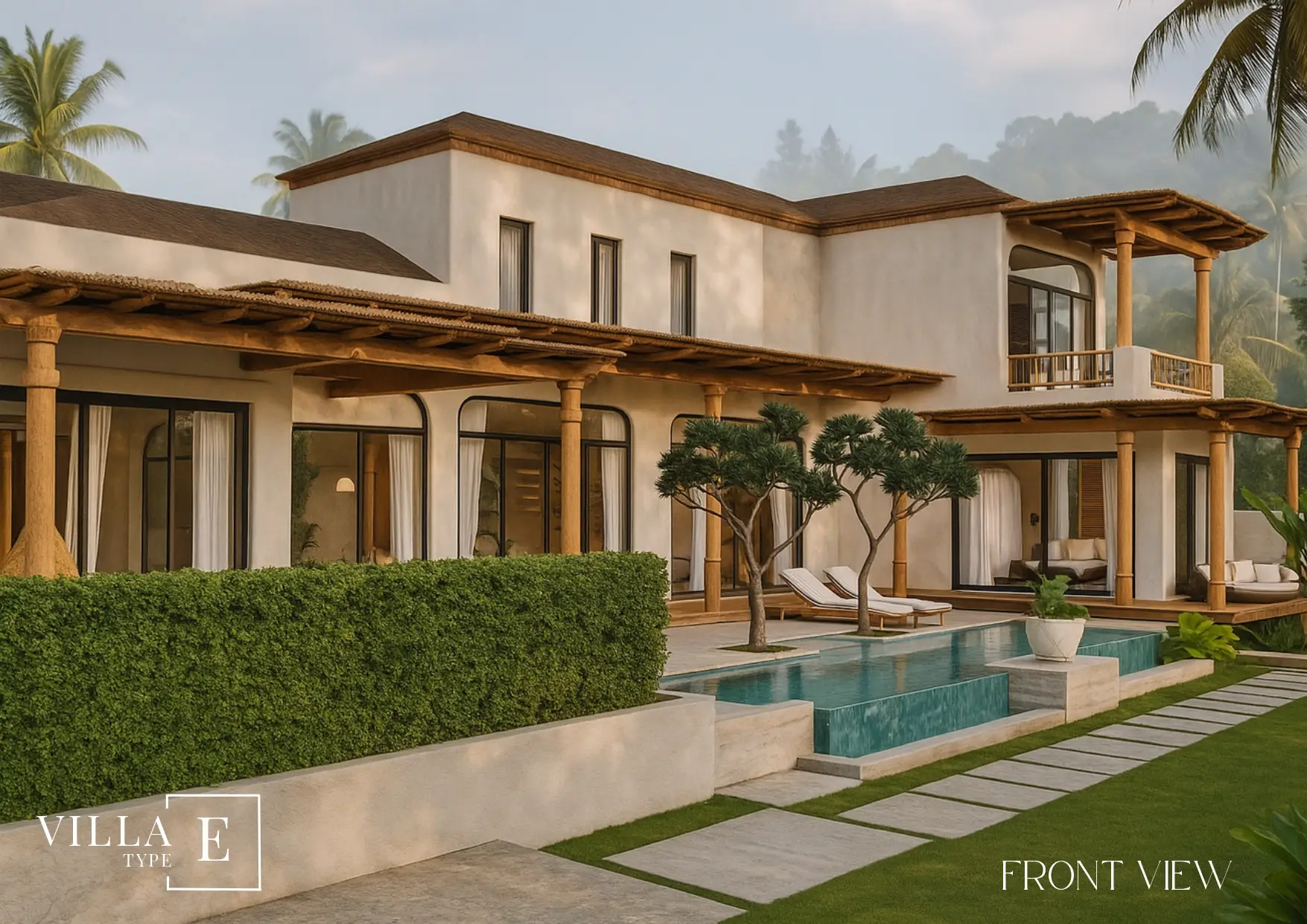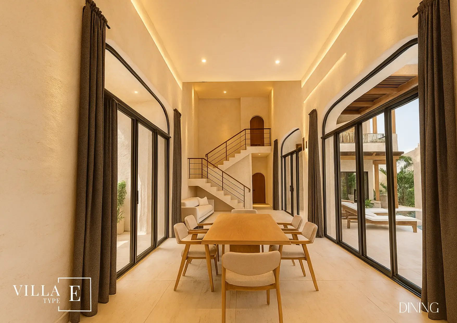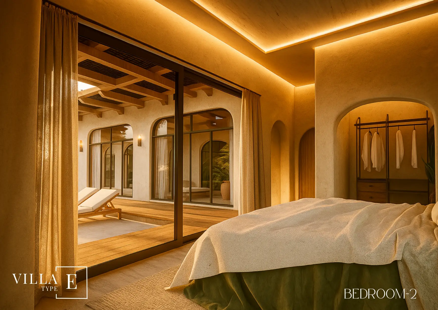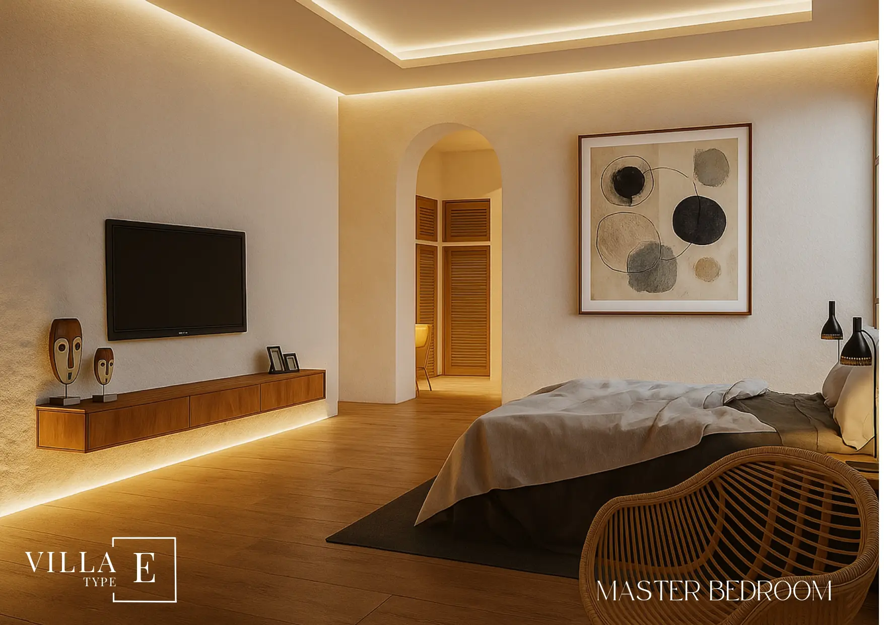 Villa E showcases the architectural identity that has made Boho Chic Village one of the most desirable destinations for modern homeowners. Every line, curve, and texture has been thoughtfully chosen to celebrate simplicity, openness, and natural flow. The use of locally sourced materials — warm wood tones, natural stone, and soft earthy hues — gives the villa an inviting and harmonious feel.
