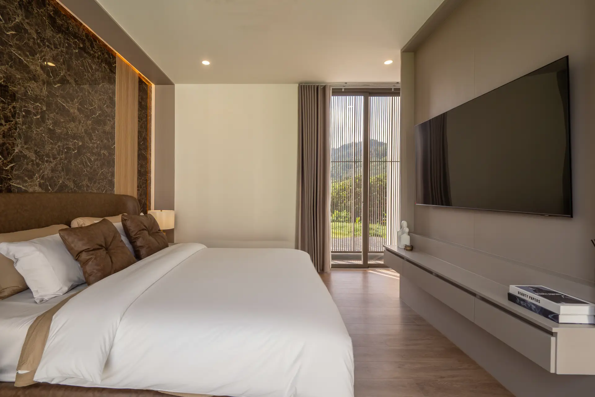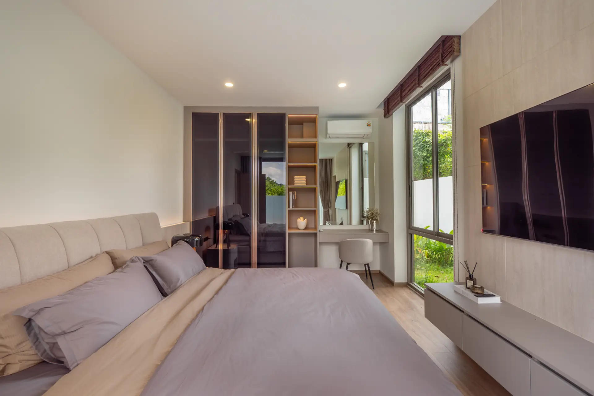 The second floor of each villa at D’Chateau Kathu is dedicated to elevated comfort and personal retreat. The master bedroom is exceptionally spacious, offering absolute privacy and a serene ambiance. It includes a walk-in closet, a lavish ensuite bathroom, and a jacuzzi bathtub, providing a spa-like experience at home.