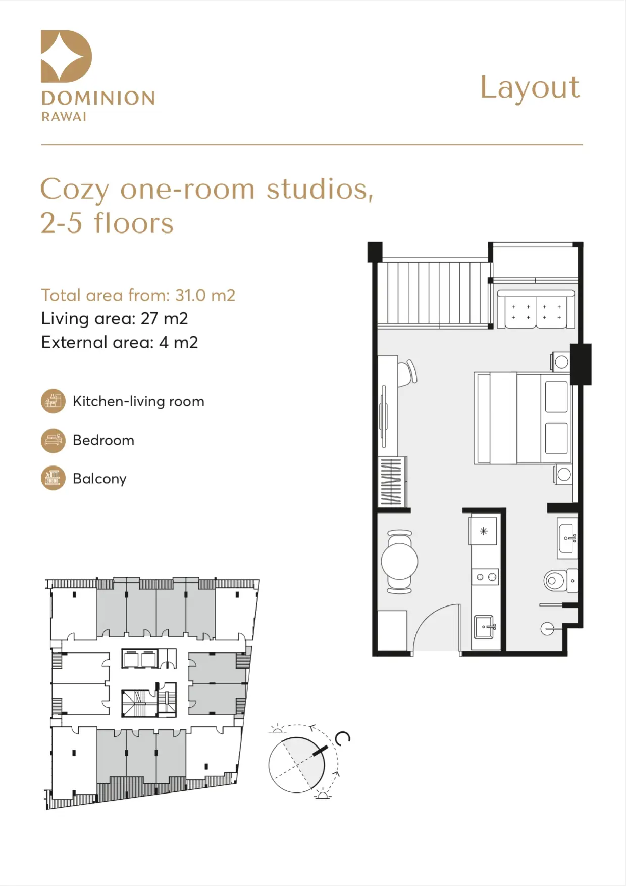 The Dominion Rawai – Studio layout ranges from 31.0 m², offering a spacious, well-zoned area that maximizes comfort and livability. Every inch of the space has been carefully planned to provide a harmonious living environment. The flow between the living area, kitchen zone, and balcony creates a seamless and comfortable experience.