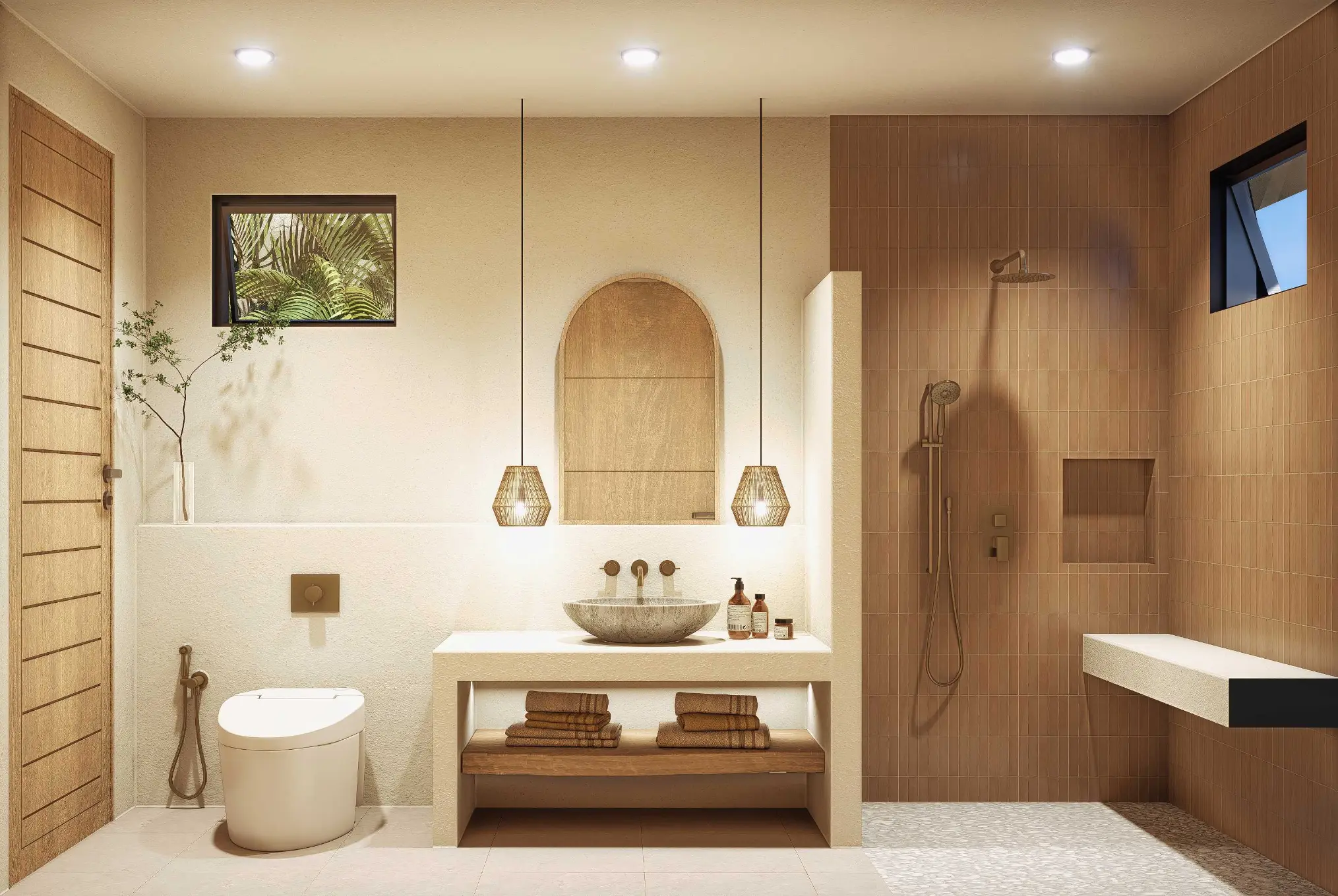 A defining feature of the 3 Bedroom Villa at Eden Rise is its elevated positioning. Built along the natural slope of the land, each villa enjoys open views over lush tropical greenery, surrounding mountains, and distant ocean horizons.
