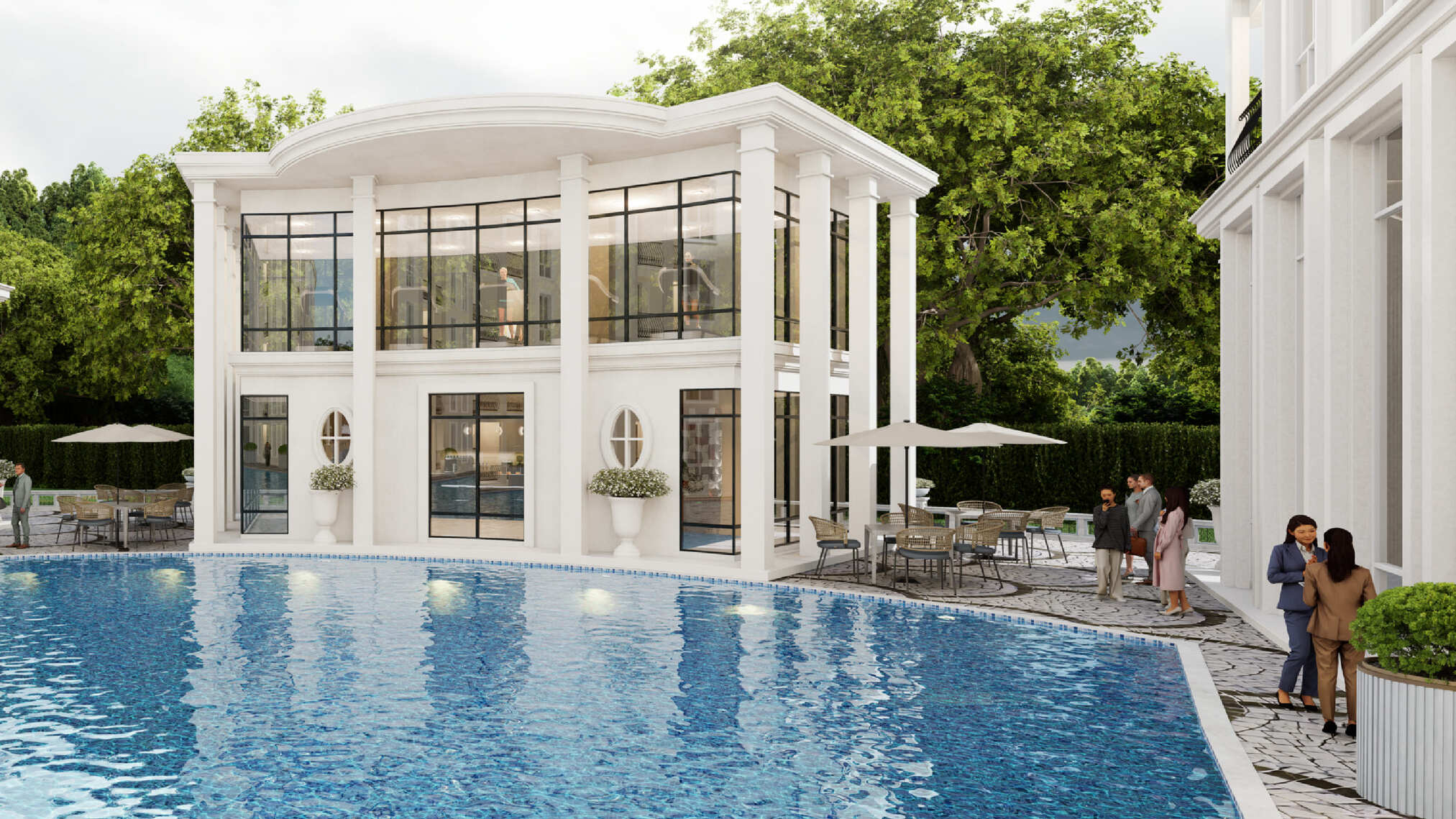 Expansive Swimming Pool with Island Gardens