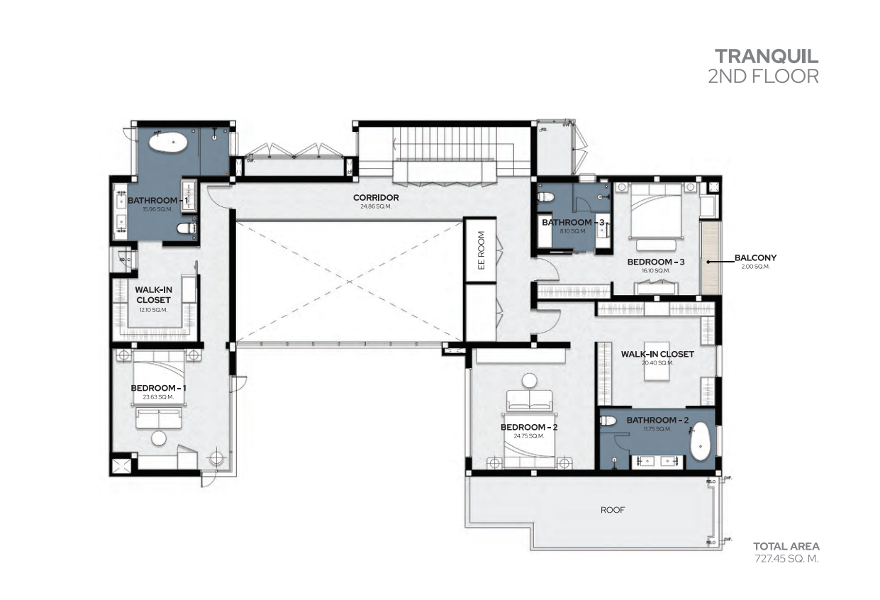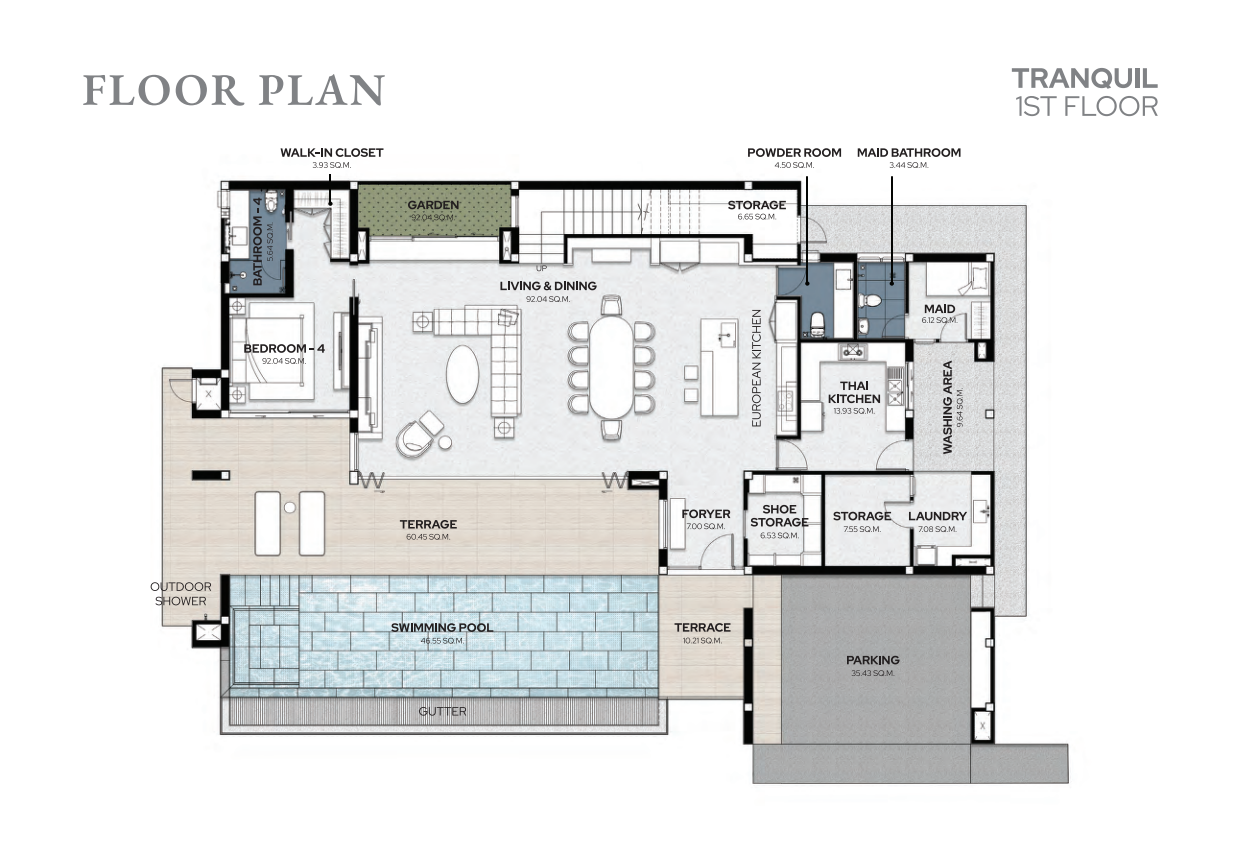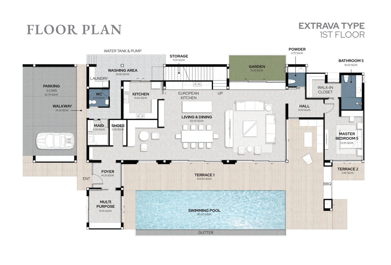These magnificent pool villas come in two expansive types—Extrava (836.10 sq.m.) and Tranquil (727.45 sq.m.)—with layouts offering 4 to 5 bedrooms across two floors. Land plots range from 590.98 to 914.02 sq.m., providing ample space for luxurious indoor-outdoor living.