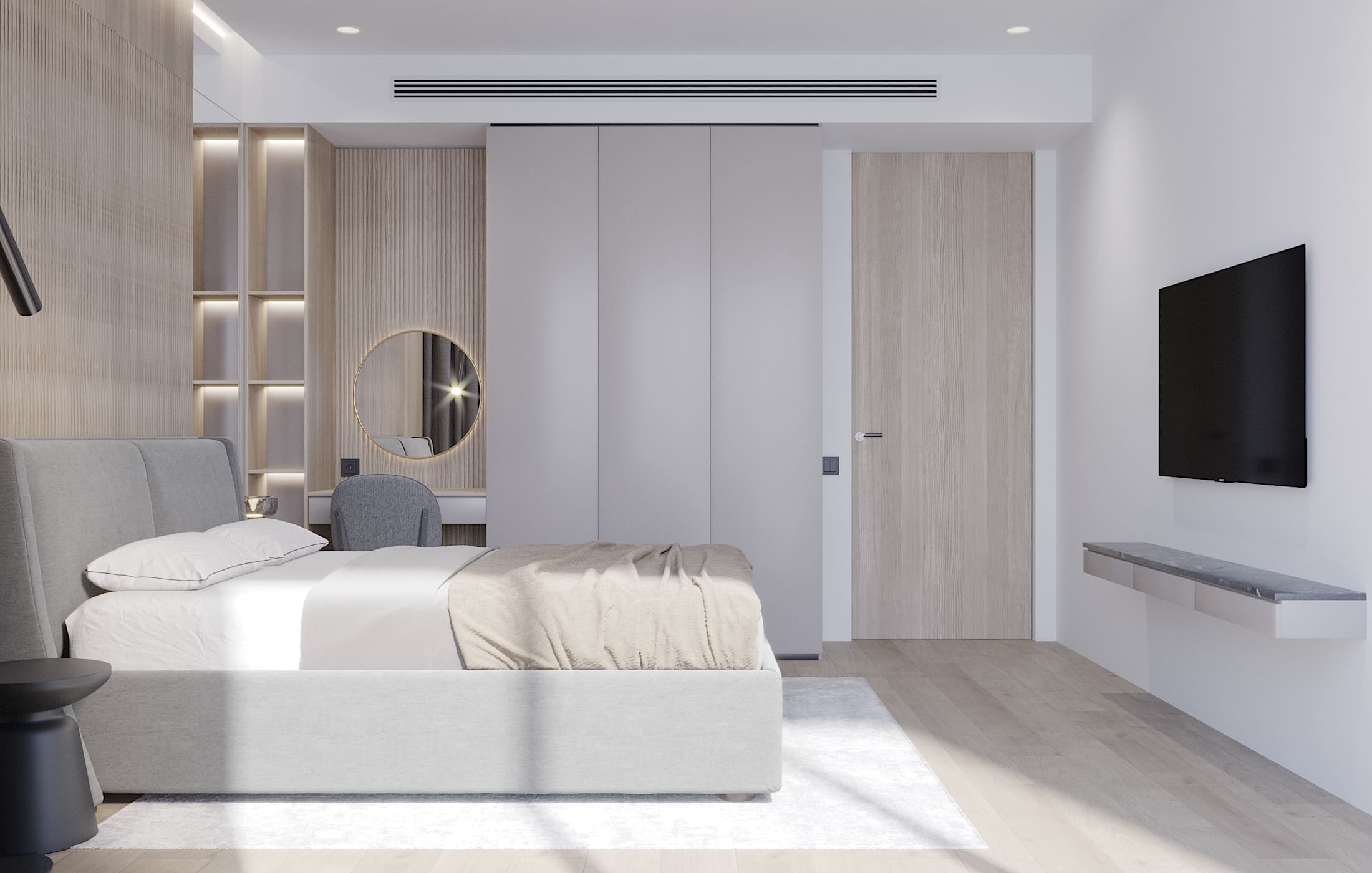 Two spacious bedrooms, each with large built-in wardrobes and soft ambient lighting