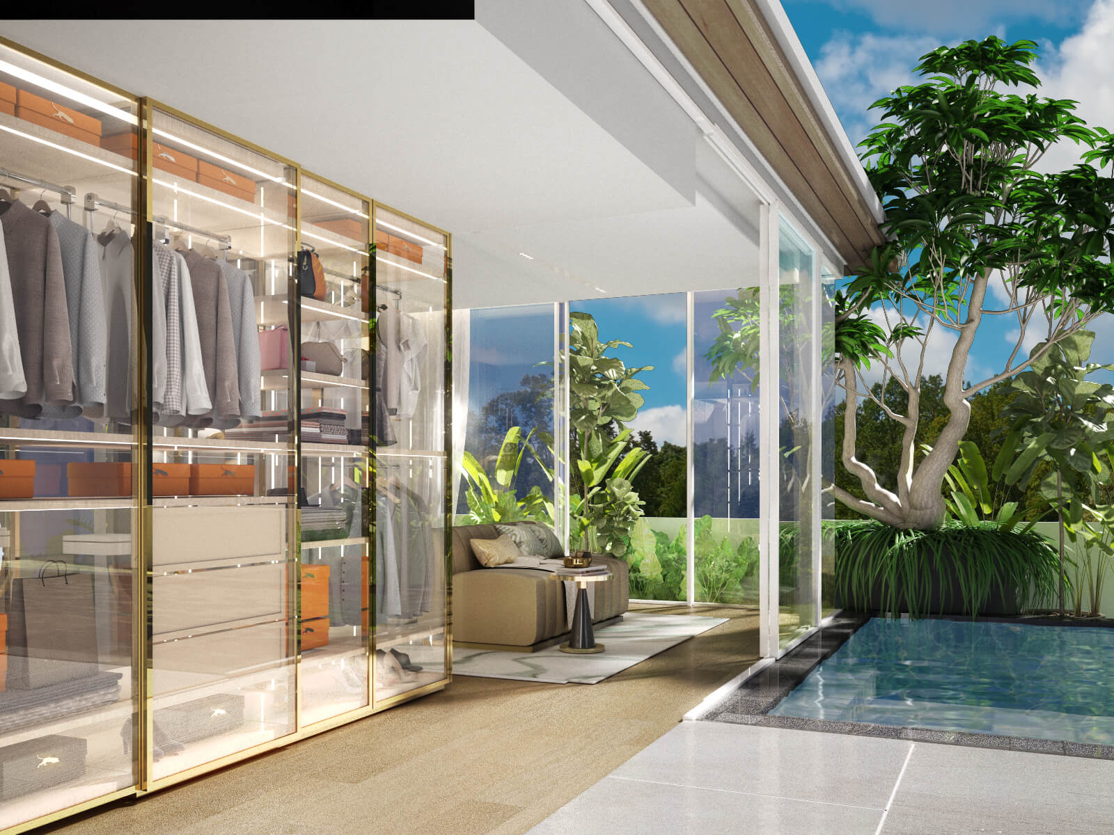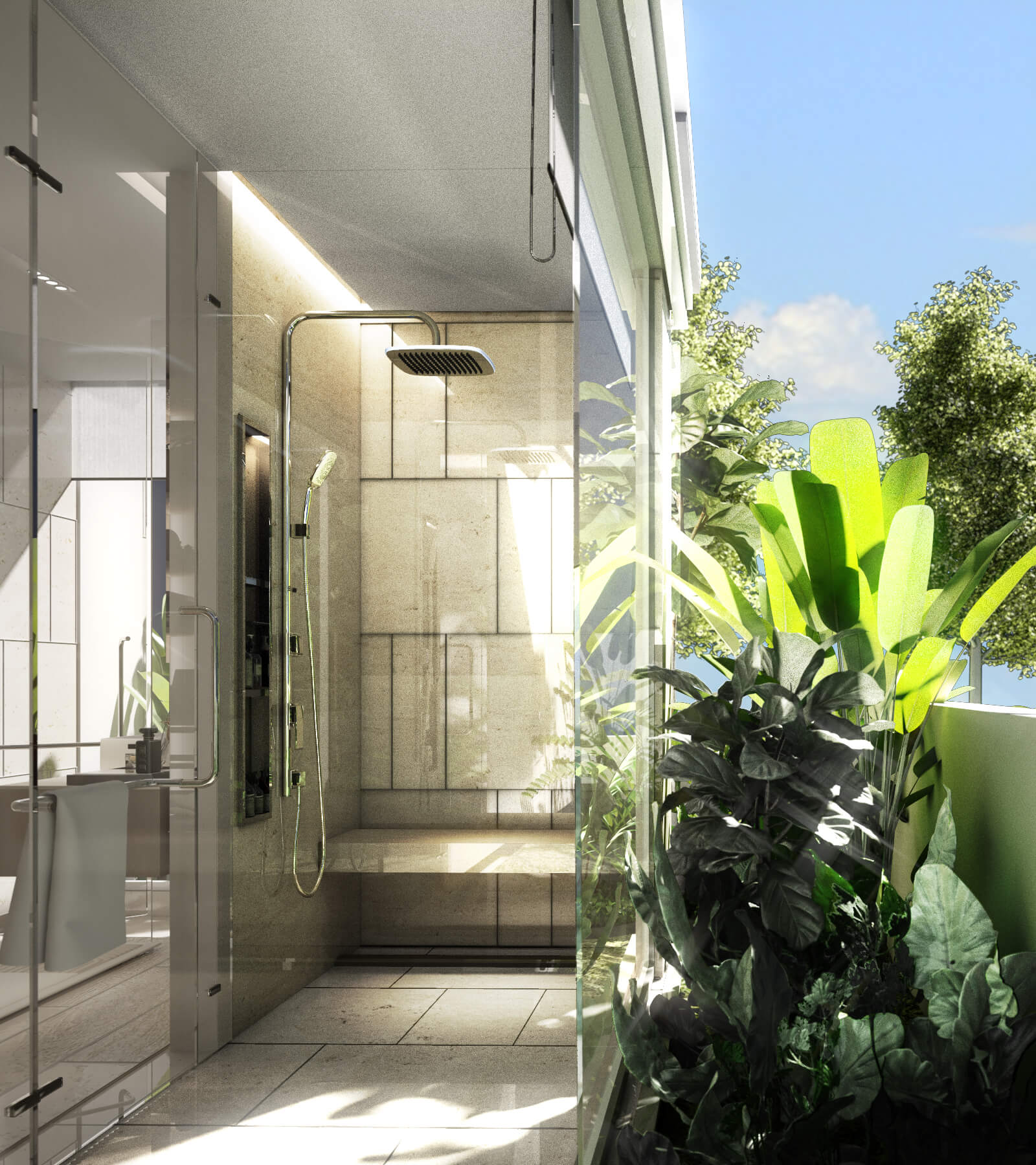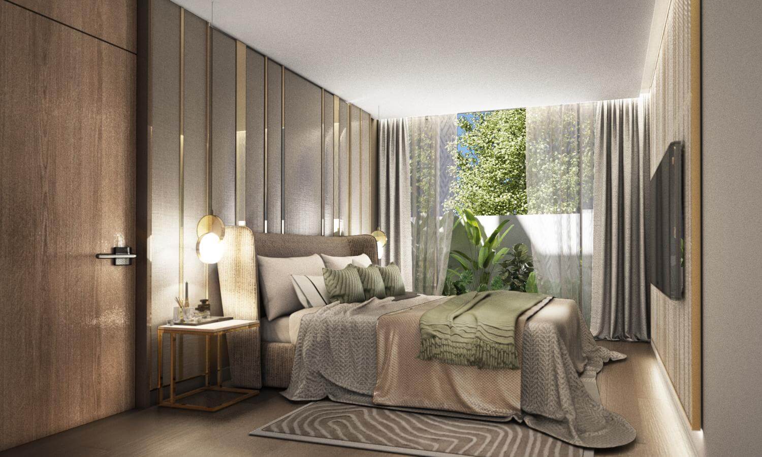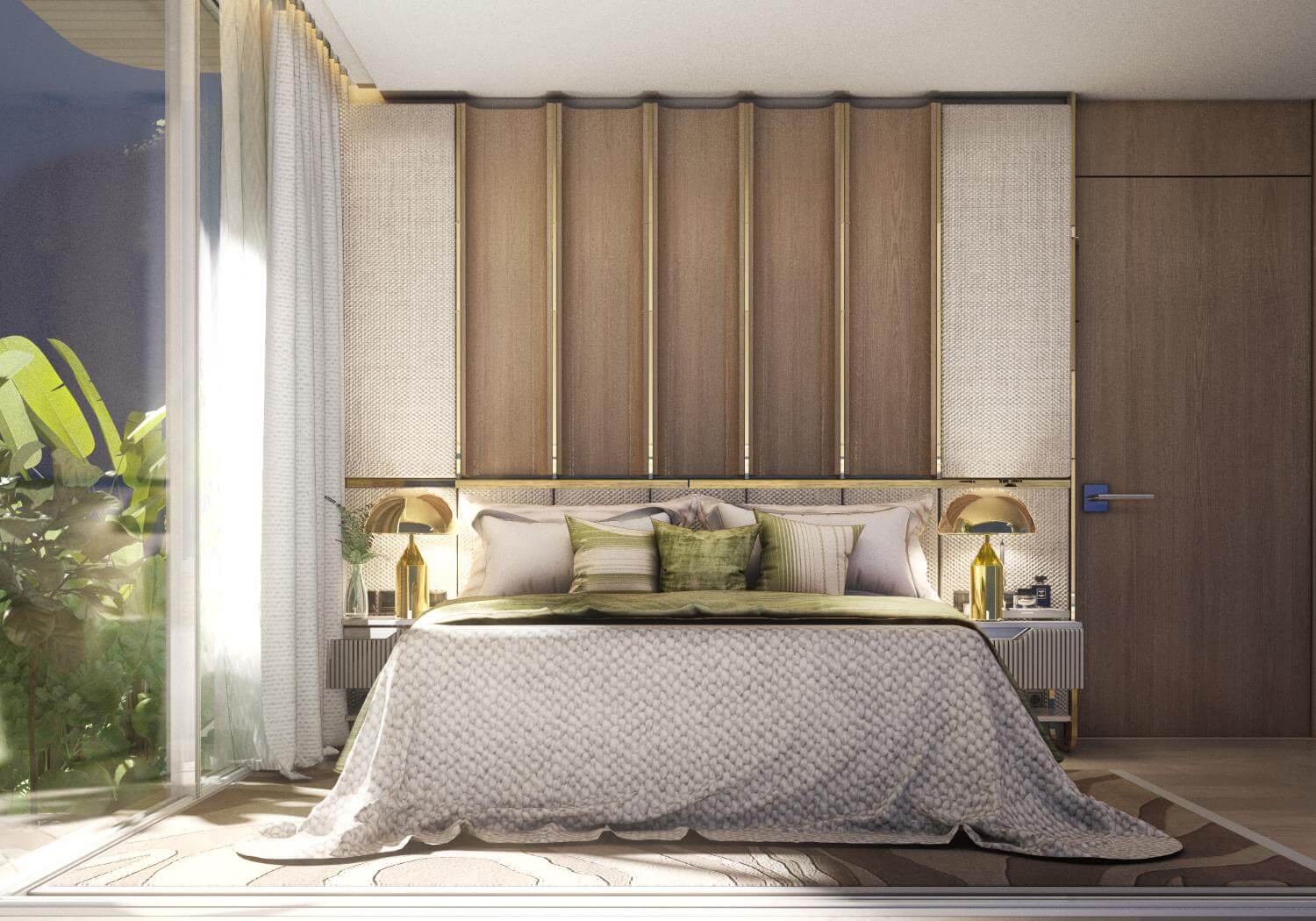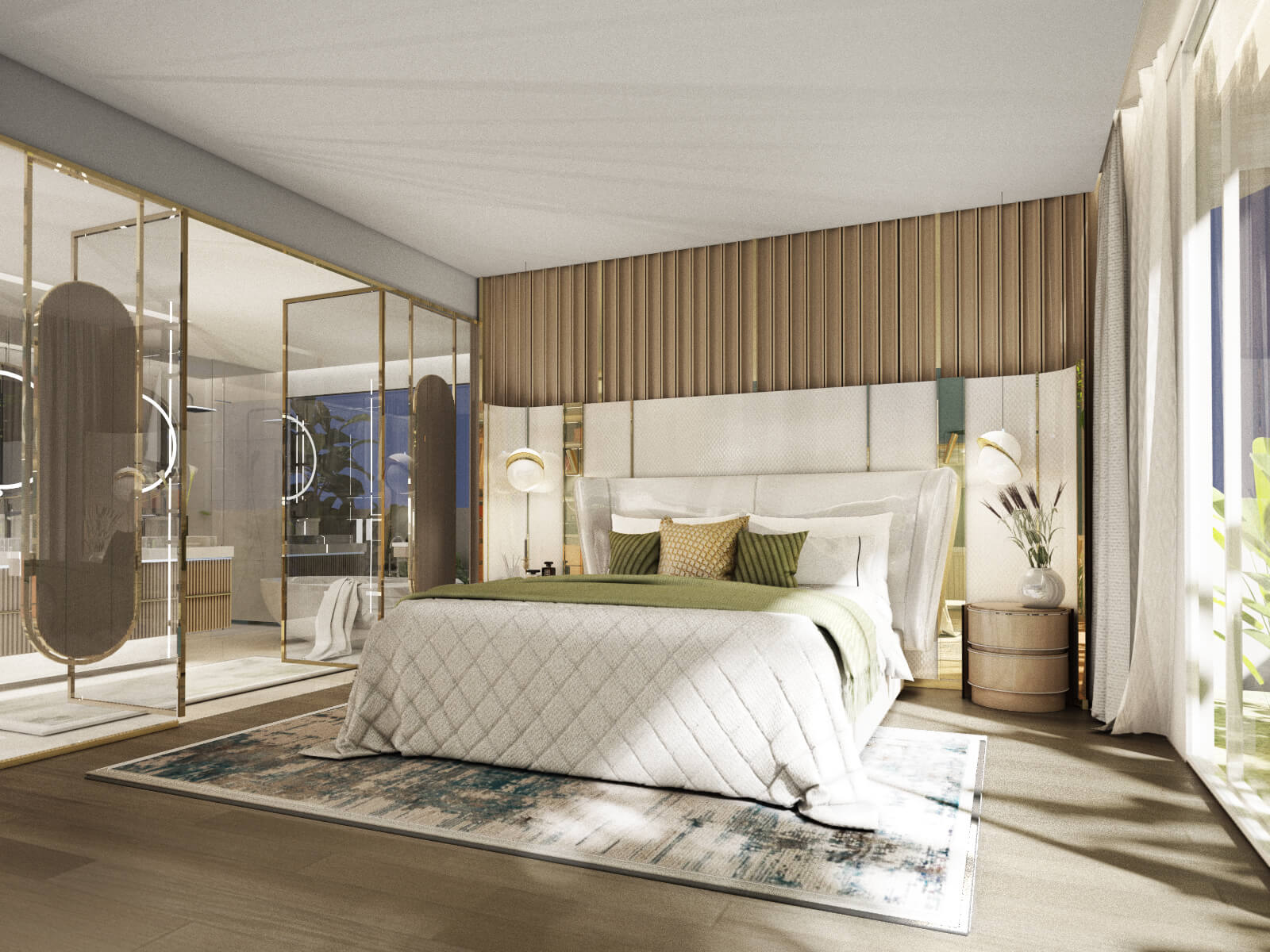 A master bedroom with en-suite bathroom, walk-in closet, and terrace views