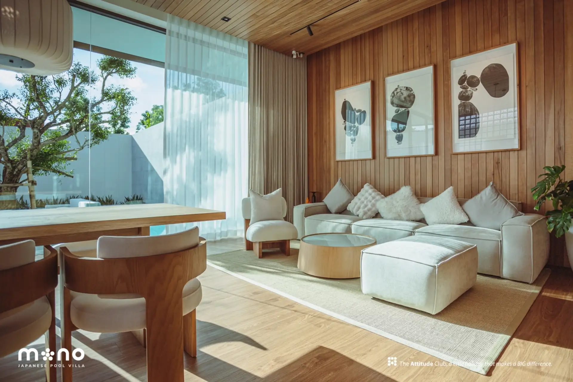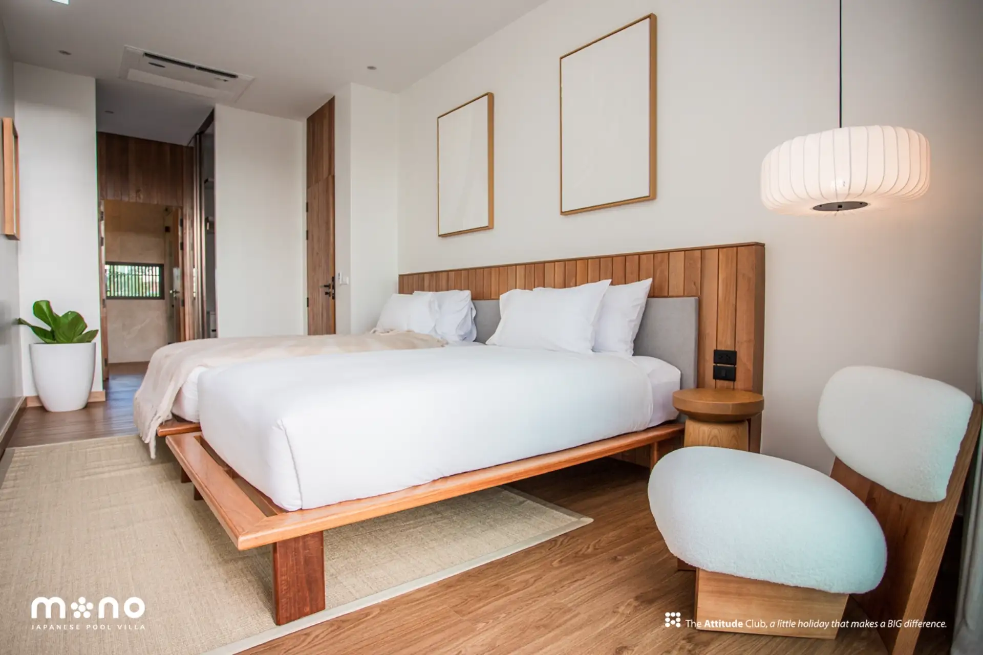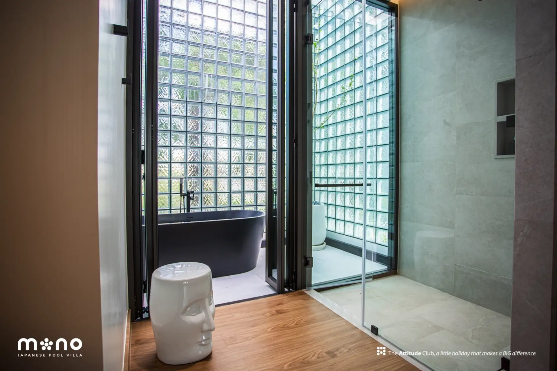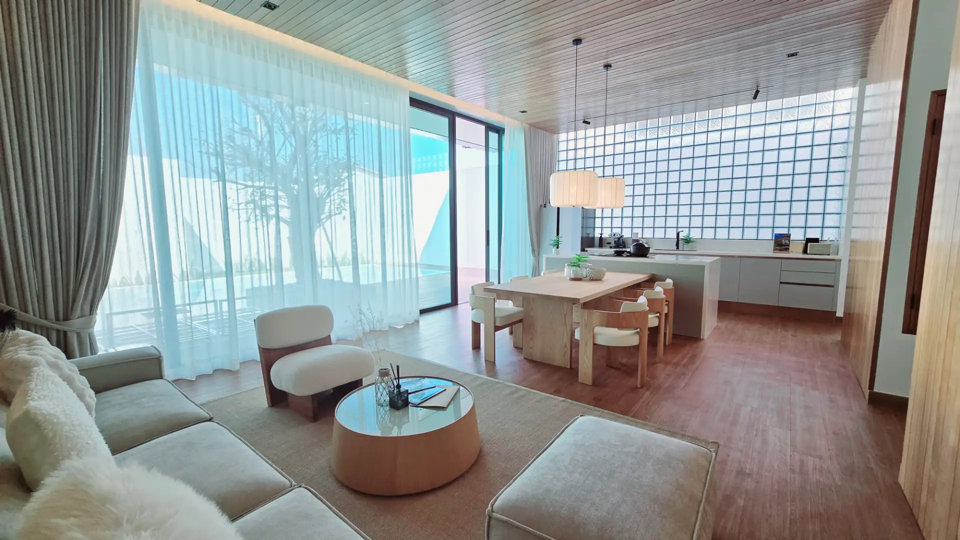 At Mono Oxygen Bangtao Beach, design is not just visual—it’s experiential. The villas follow a refined aesthetic that draws from Japanese and tropical influences, featuring an elegant balance of textures and natural finishes. The SPC wood-finished flooring, solid wood accents, glass block decorative walls, and plywood ceilings create a warm, welcoming atmosphere throughout the interiors.