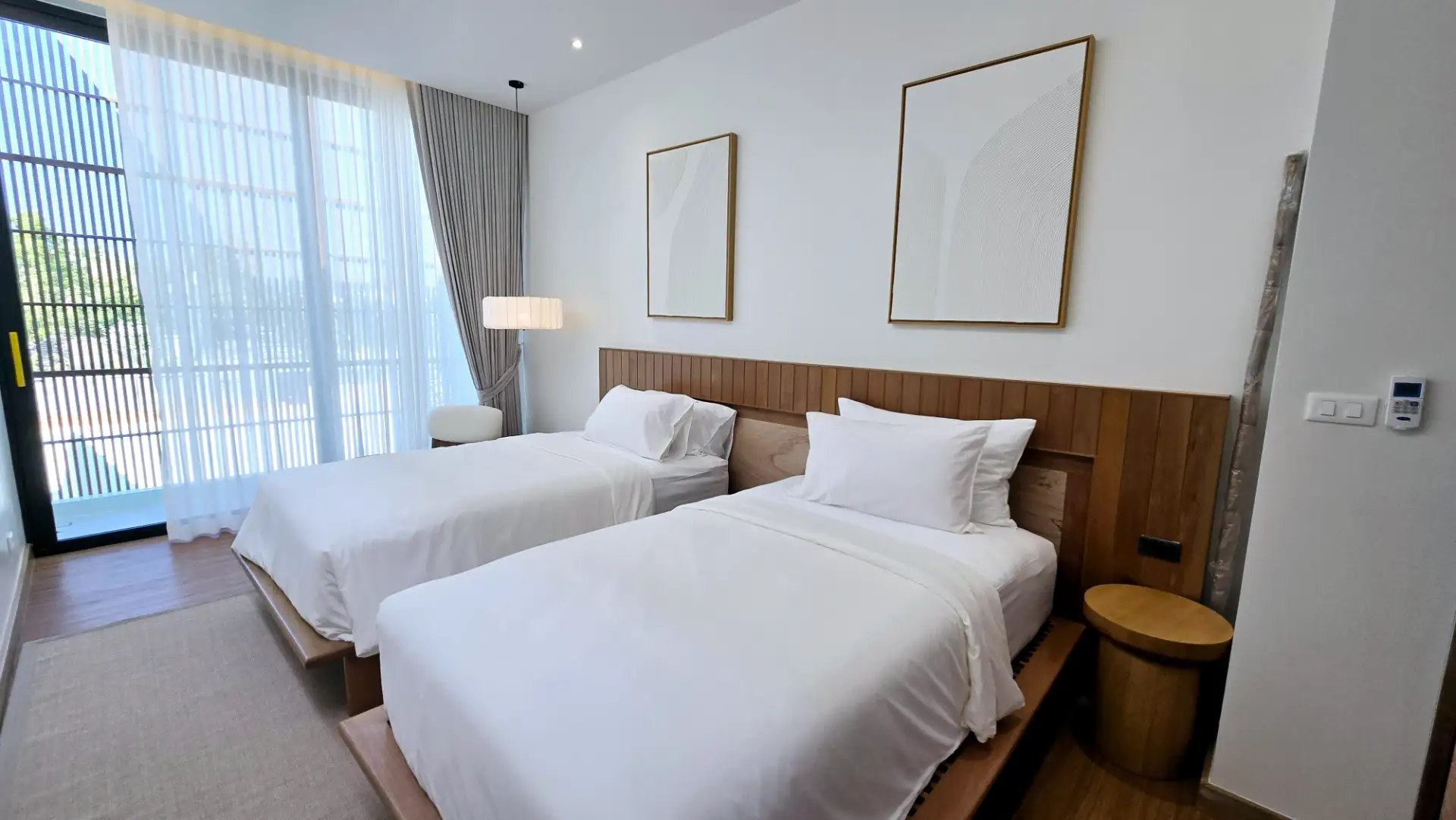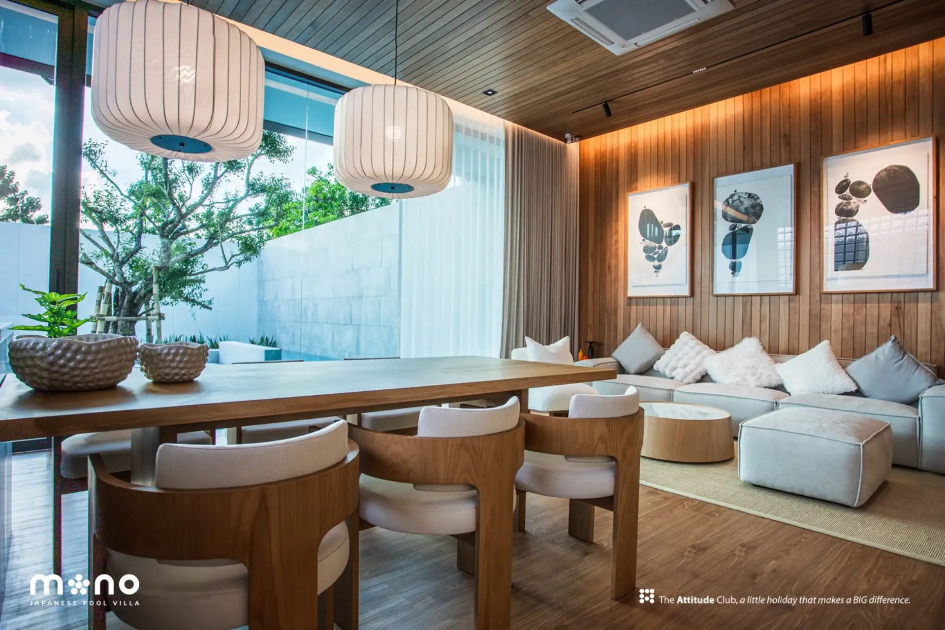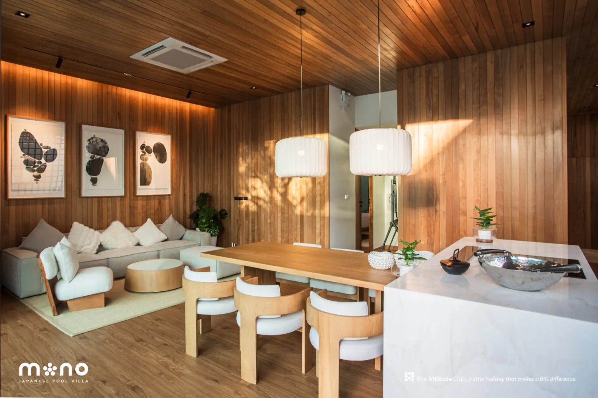 At Mono Oxygen Bangtao Beach, design is not just visual—it’s experiential. The villas follow a refined aesthetic that draws from Japanese and tropical influences, featuring an elegant balance of textures and natural finishes. The SPC wood-finished flooring, solid wood accents, glass block decorative walls, and plywood ceilings create a warm, welcoming atmosphere throughout the interiors.