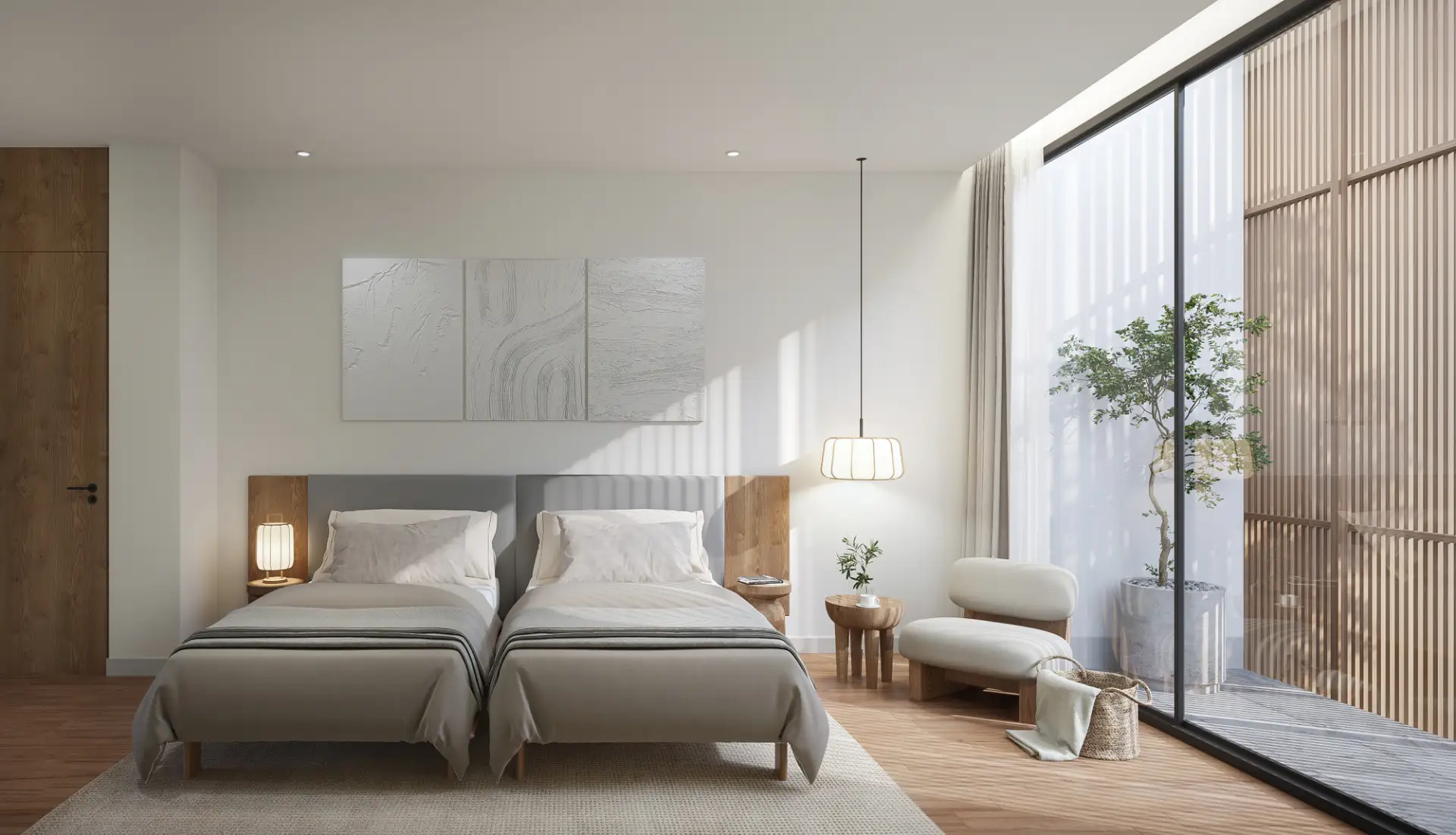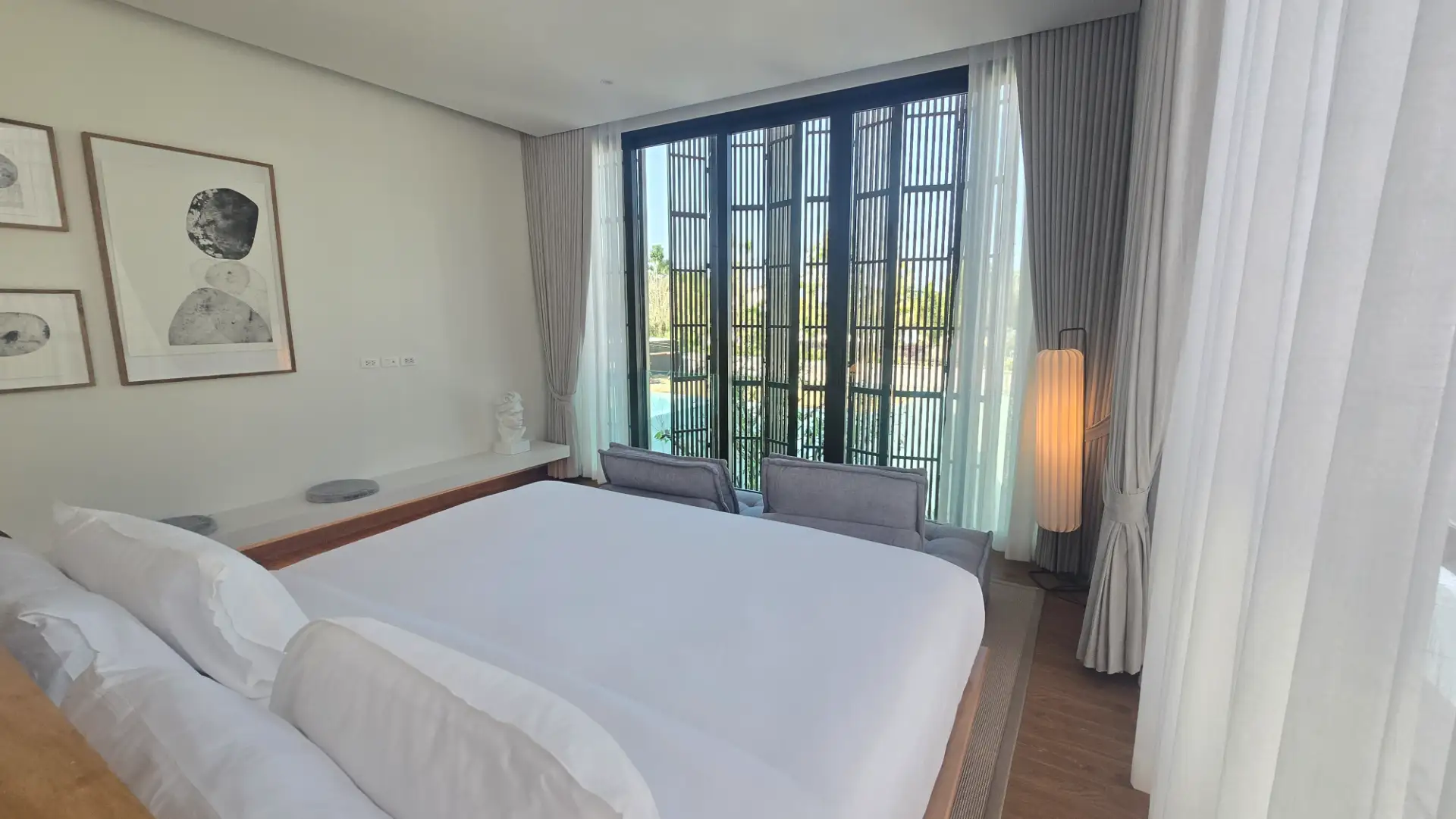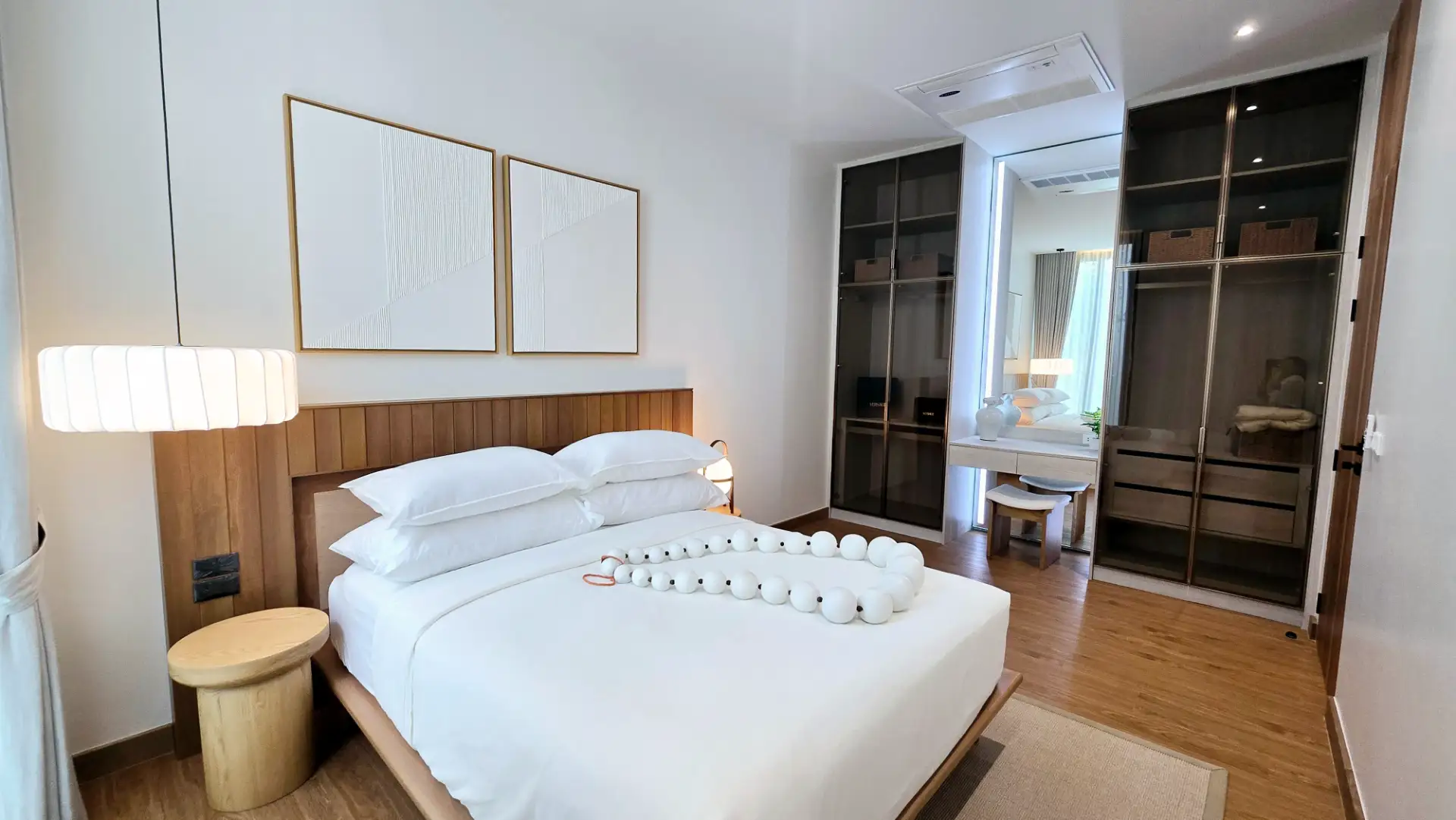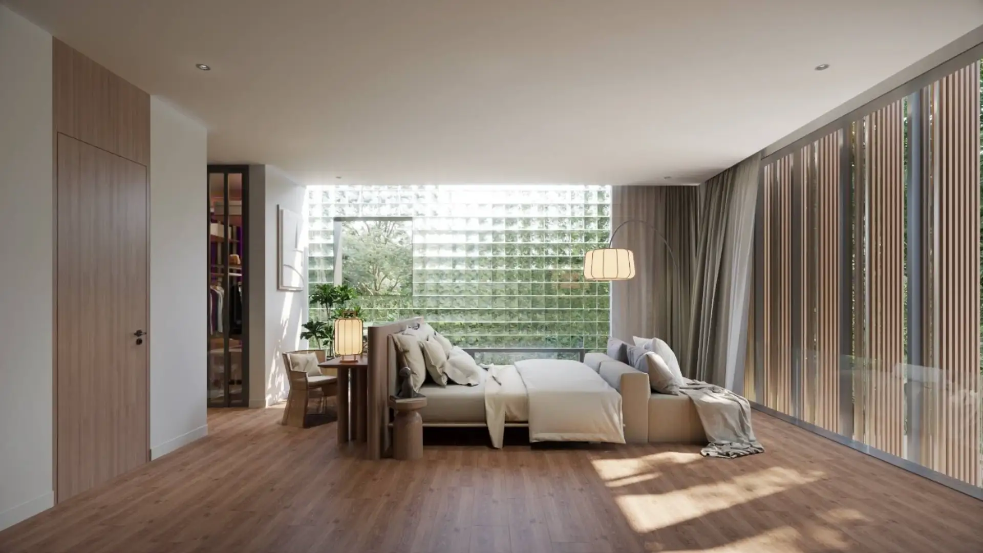 At Mono Oxygen Bangtao Beach, design is not just visual—it’s experiential. The villas follow a refined aesthetic that draws from Japanese and tropical influences, featuring an elegant balance of textures and natural finishes. The SPC wood-finished flooring, solid wood accents, glass block decorative walls, and plywood ceilings create a warm, welcoming atmosphere throughout the interiors.