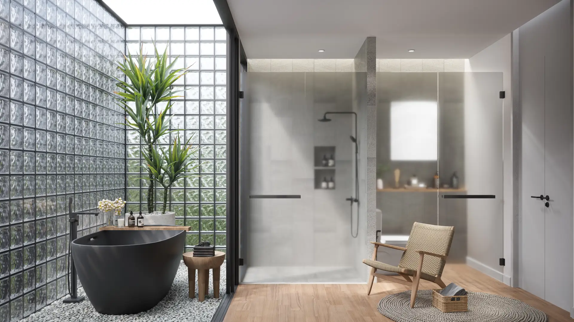 Glass block detailing to infuse artistic flair and privacy.