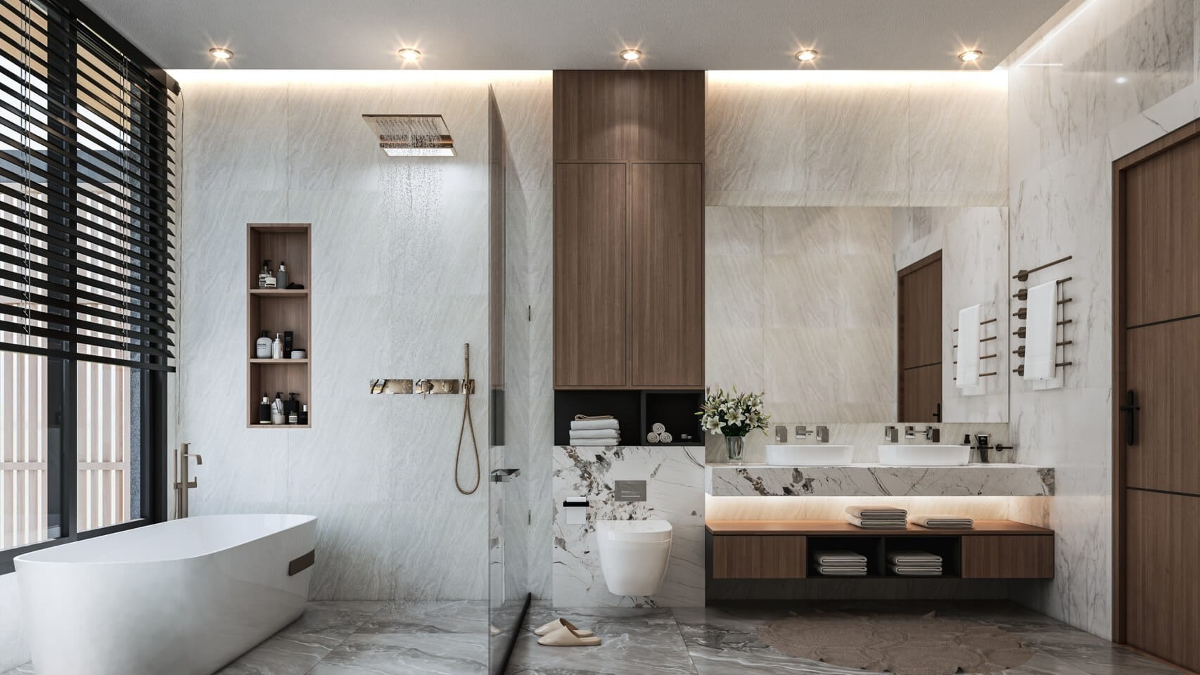 Upstairs, four large ensuite bedrooms offer luxurious comfort and privacy, each with its own sleek bathroom and access to private balconies overlooking the garden and pool. The master suite is a standout, featuring a private balcony, walk-in closet, and a spa-inspired bathroom with high-end fixtures.