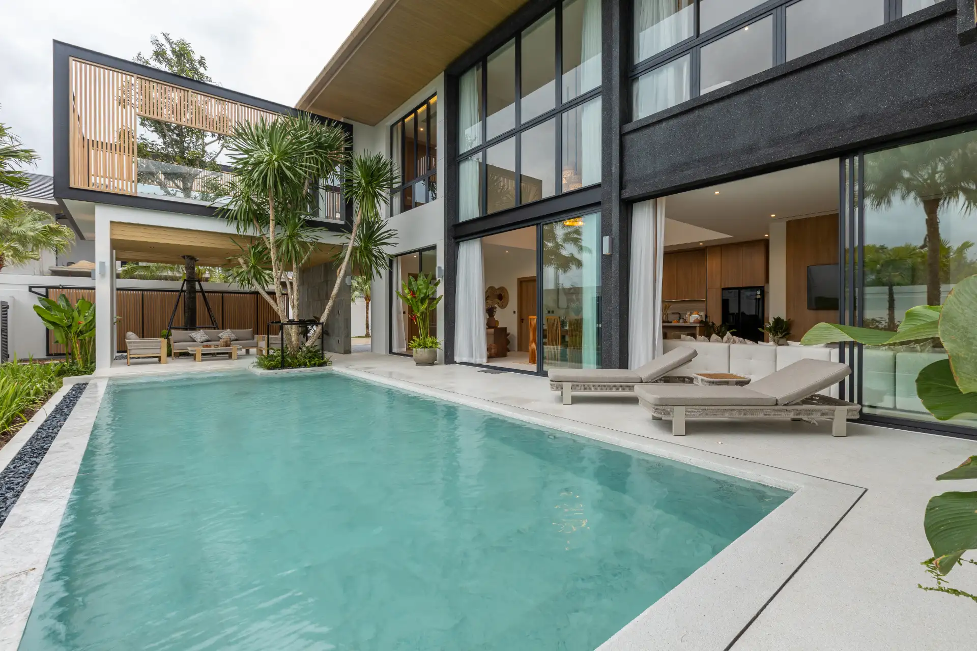 The villa also includes a Thai kitchen, providing a designated space for authentic cooking, and a guest toilet for added convenience. Storage is well thought out, with a dedicated laundry area, washing zone, and garage, ensuring functionality never compromises style.