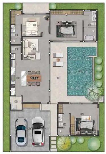 The 3-bedroom villas at Mouana Residence are intelligently crafted to make the most of every square meter. With usable areas ranging from 330 to 365 sqm, these single-story homes offer a seamless flow of space, blending indoor and outdoor living effortlessly.