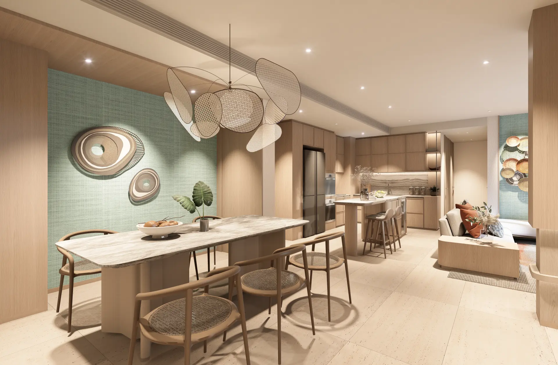 The living and dining areas flow seamlessly into the kitchen, forming a cohesive space for family gatherings, entertaining guests, or simply enjoying quiet evenings at home. High-quality materials, neutral tones, and contemporary finishes define the interior aesthetic — delivering a sense of understated luxury that never feels overwhelming.