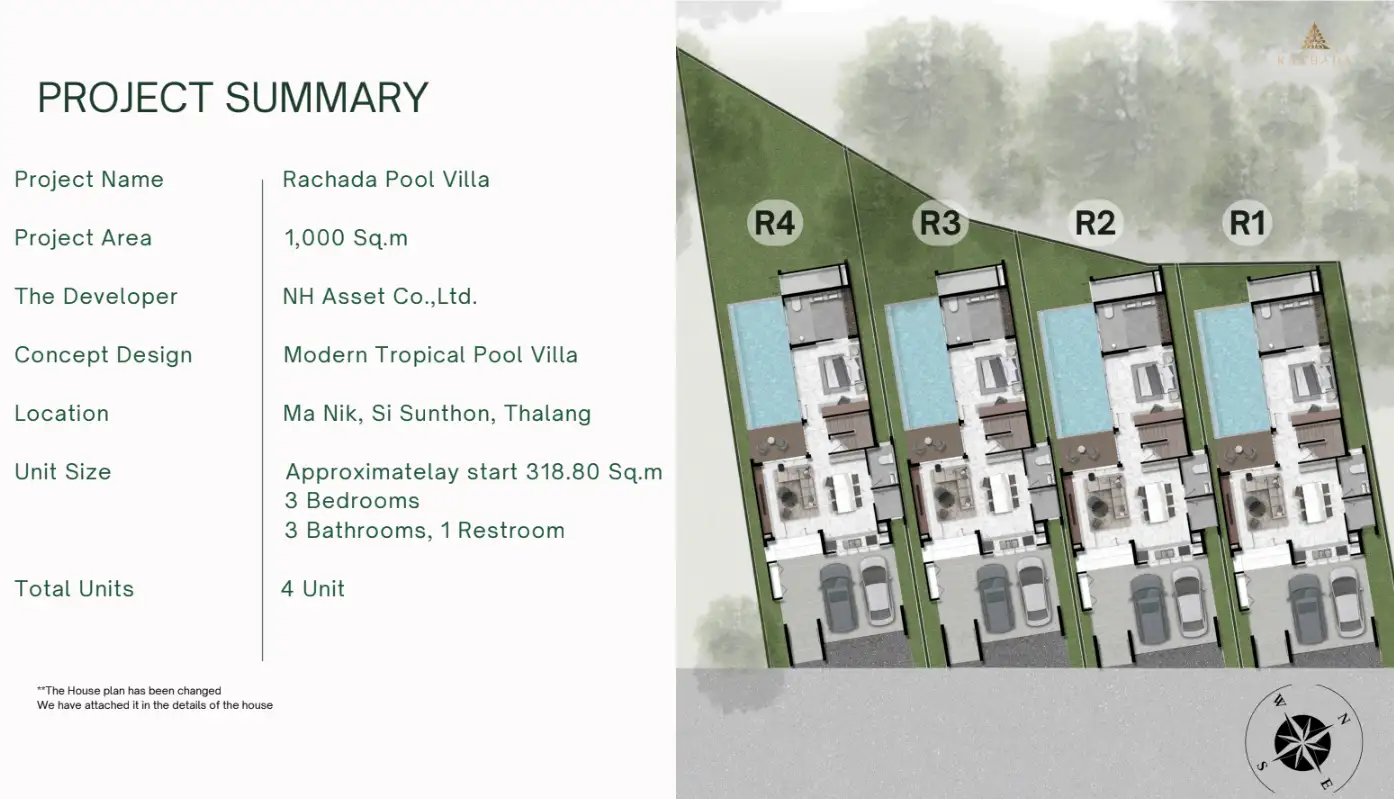 Developed by NH Asset Co., Ltd., Rachada Pool Villas is designed with a Modern Tropical aesthetic — blending elegant architecture with nature-inspired finishes and intelligent space planning. Each villa spans a generous 318.80+ sqm across two floors, offering 3 spacious bedrooms, 3 bathrooms, 1 guest restroom, and abundant indoor-outdoor living spaces.