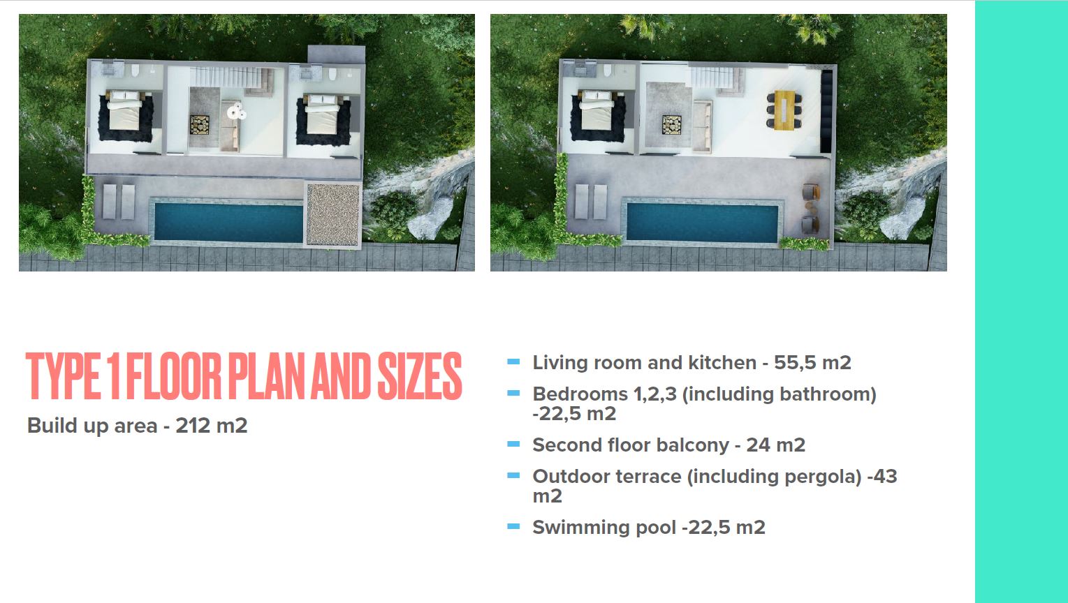 Villa A offers a perfectly proportioned layout with 212 square meters of build-up area spread over two storeys. This villa features: