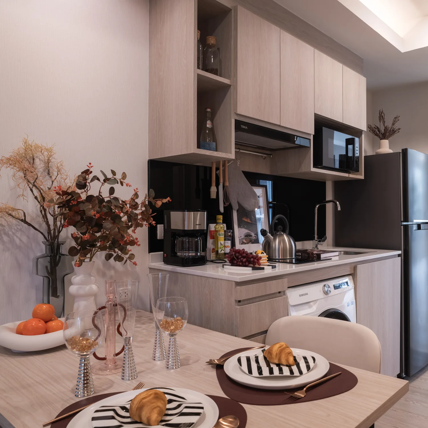 The cleverly integrated sleeping area includes space for a queen-size bed with stylish built-in storage, ensuring a cozy and practical resting space. - Kitchenette: