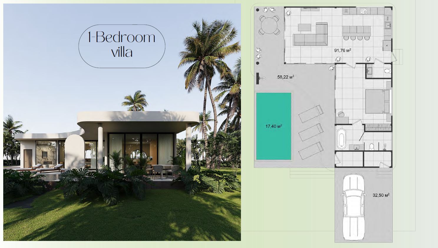 1-Bedroom Villas: Living space of 91.8 sqm with private swimming pools and spacious terraces