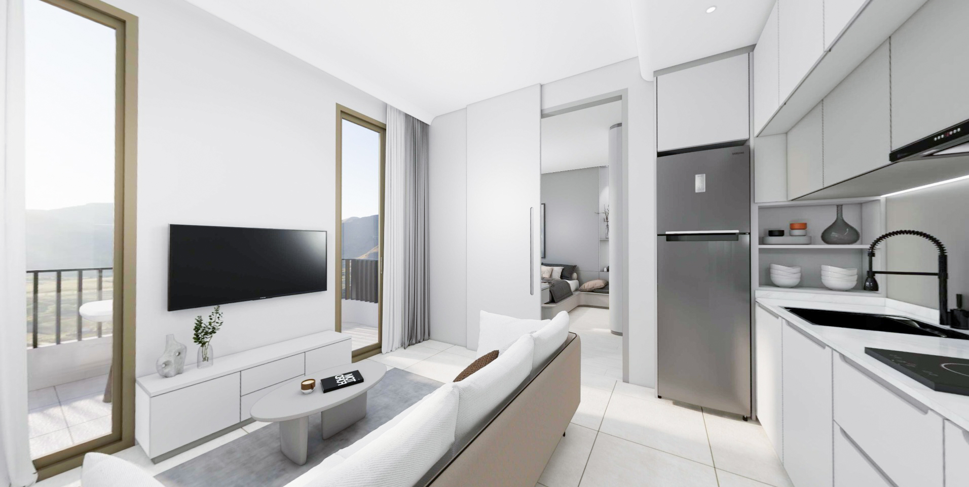 The kitchen is a compact yet fully equipped space featuring sleek cabinetry, high-end appliances, and ample counter space. It’s perfect for preparing anything from quick breakfasts to full meals, catering to both everyday living and special occasions.