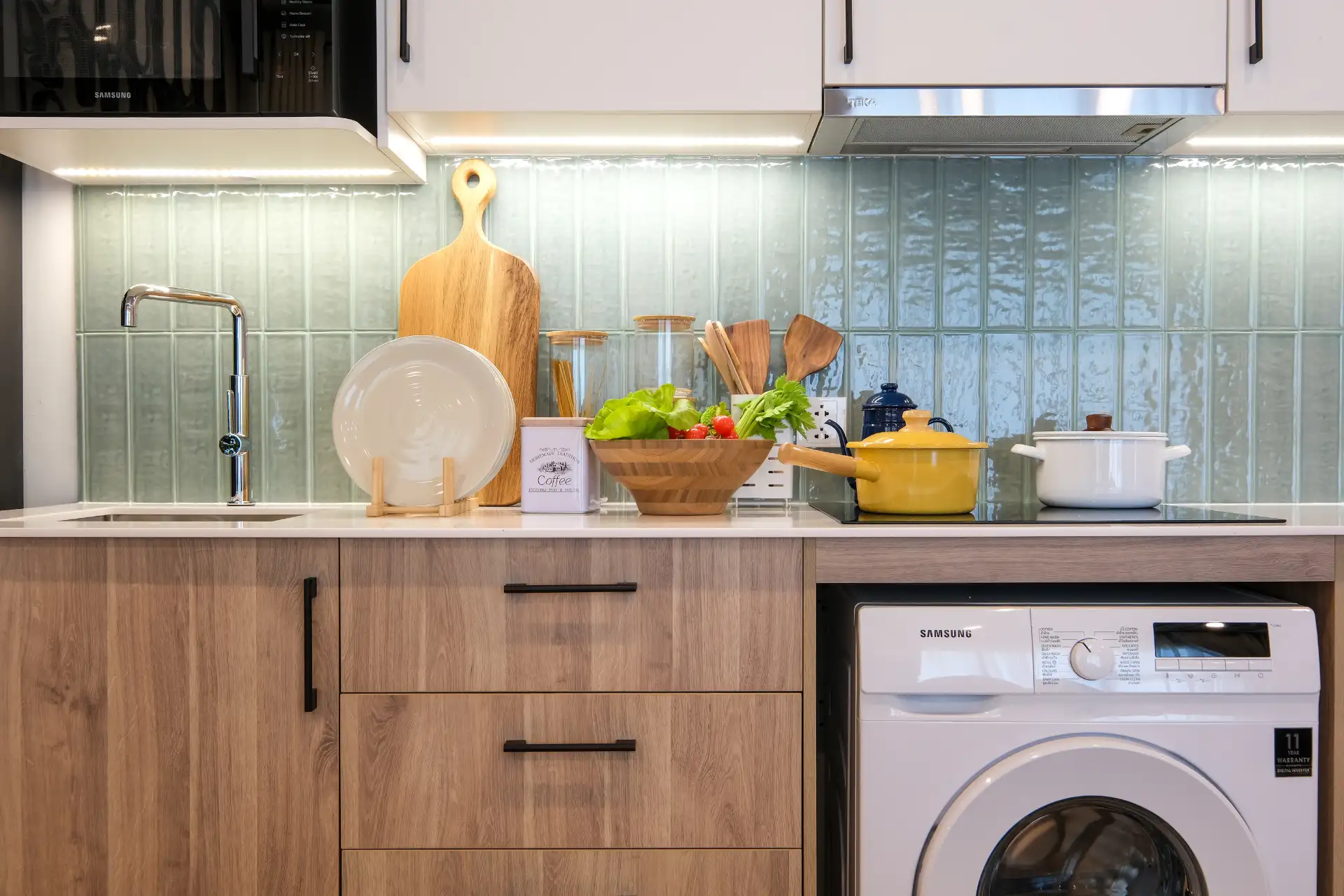 A fully fitted kitchen with European-style cabinetry and modern appliances