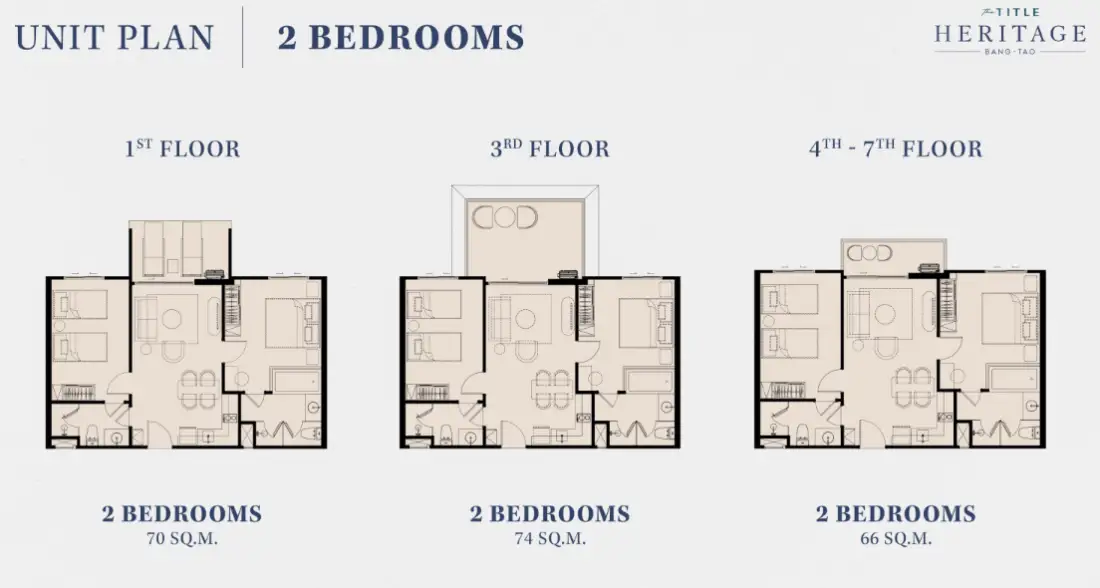 The Title Heritage Bang-Tao – 2BR units offer spacious living with layouts ranging from 66 to 106 square meters, catering to residents who appreciate generous interiors and functional design.