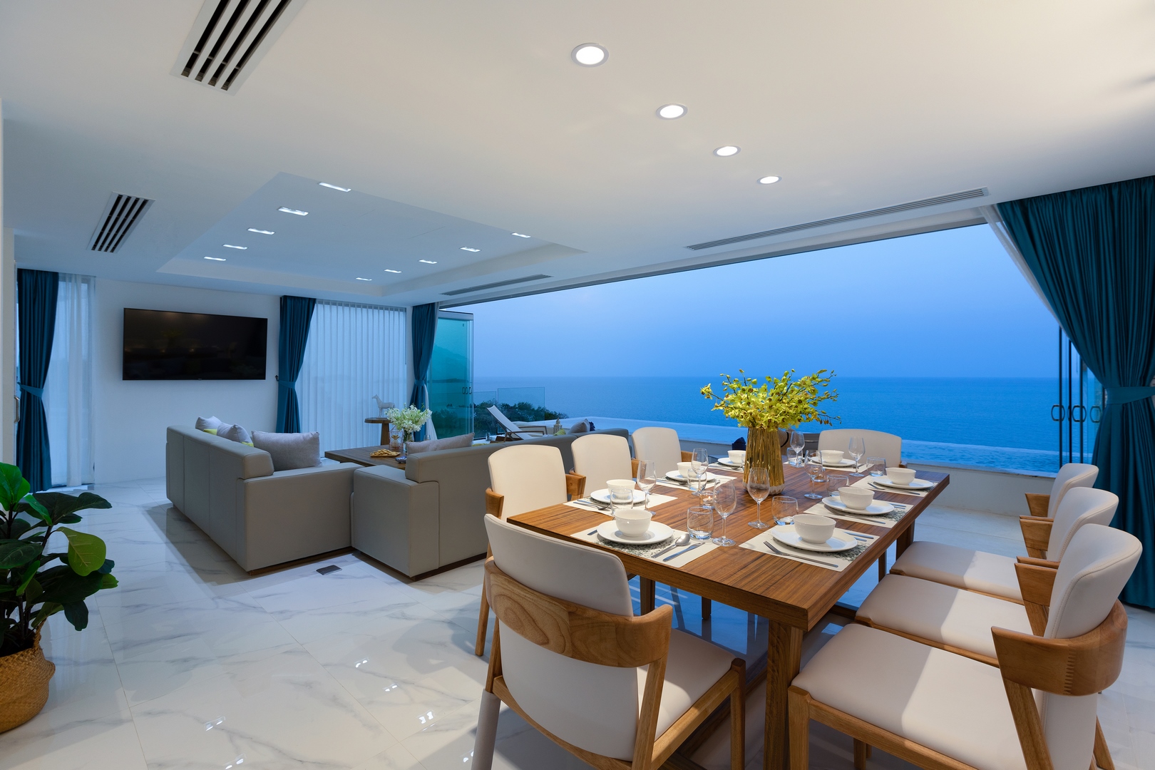 ✔ Open-plan living and dining area with high ceilings and modern furnishings.