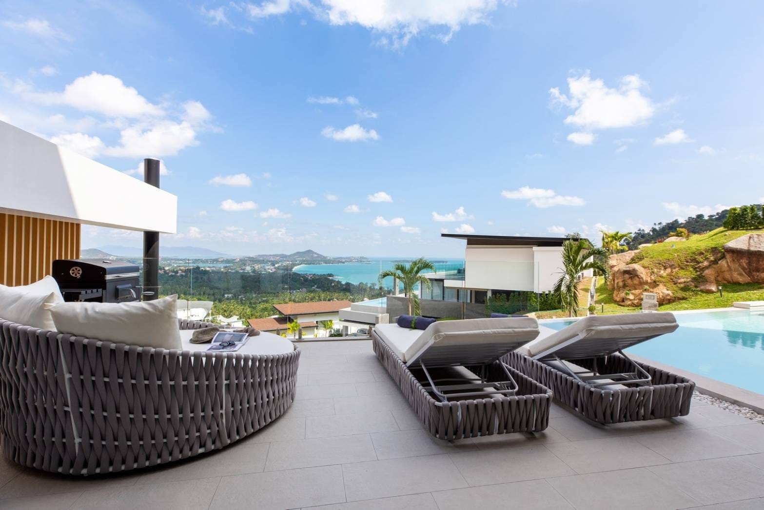 The villa’s tropical modern design perfectly complements its natural surroundings, blending harmoniously with the lush greenery, coconut trees, and dramatic granite boulders of Chaweng Noi.