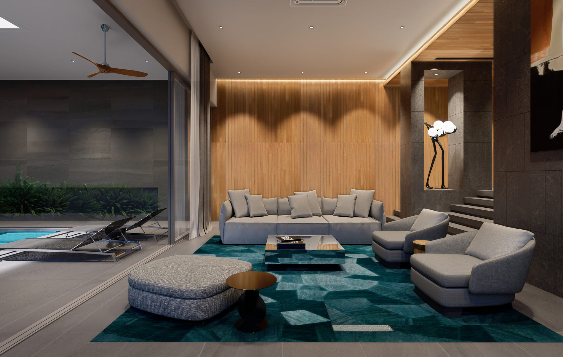 Living area (47.59 sq.m.) bathed in natural light with garden and pool views