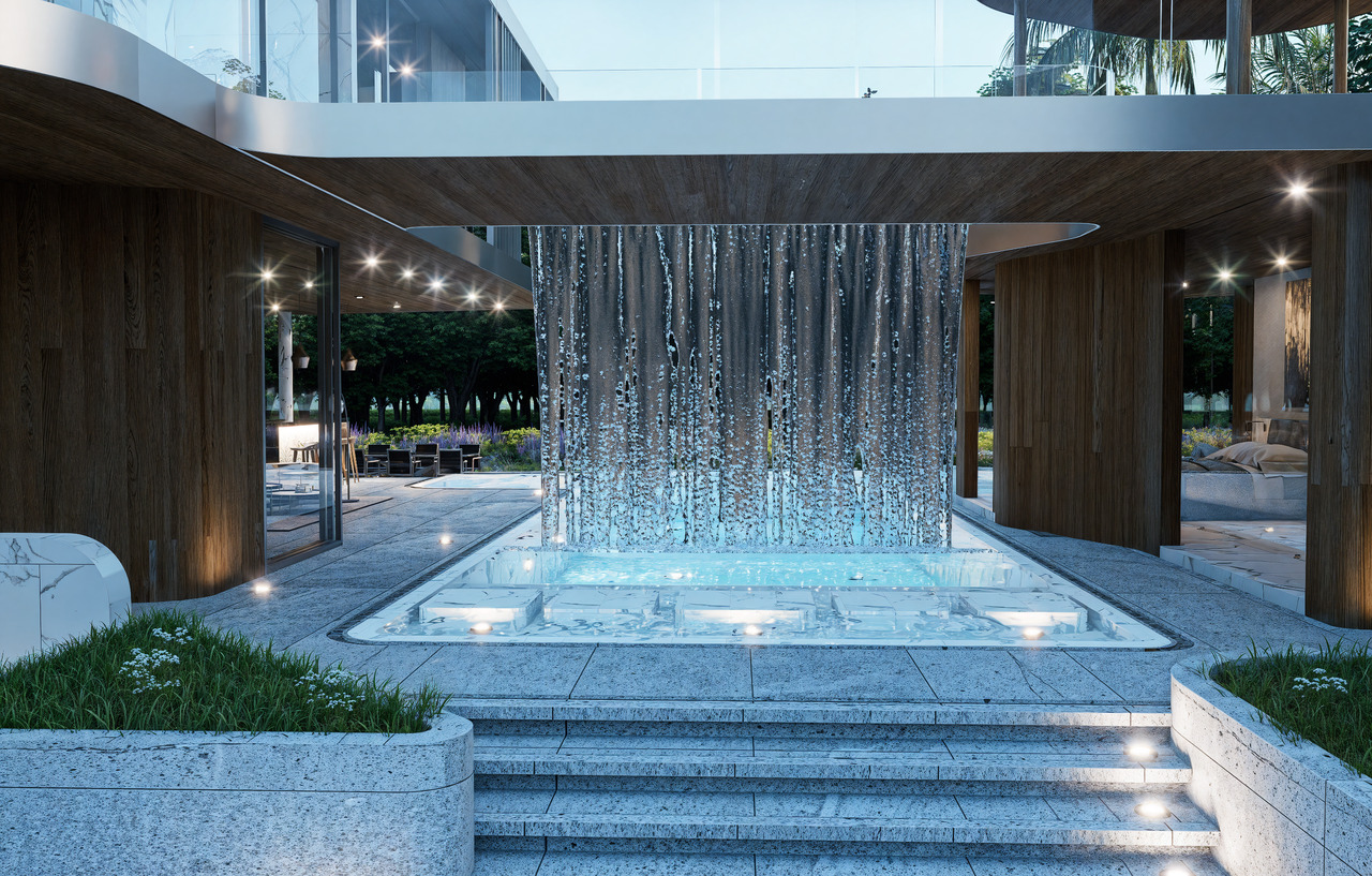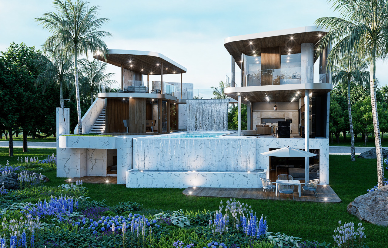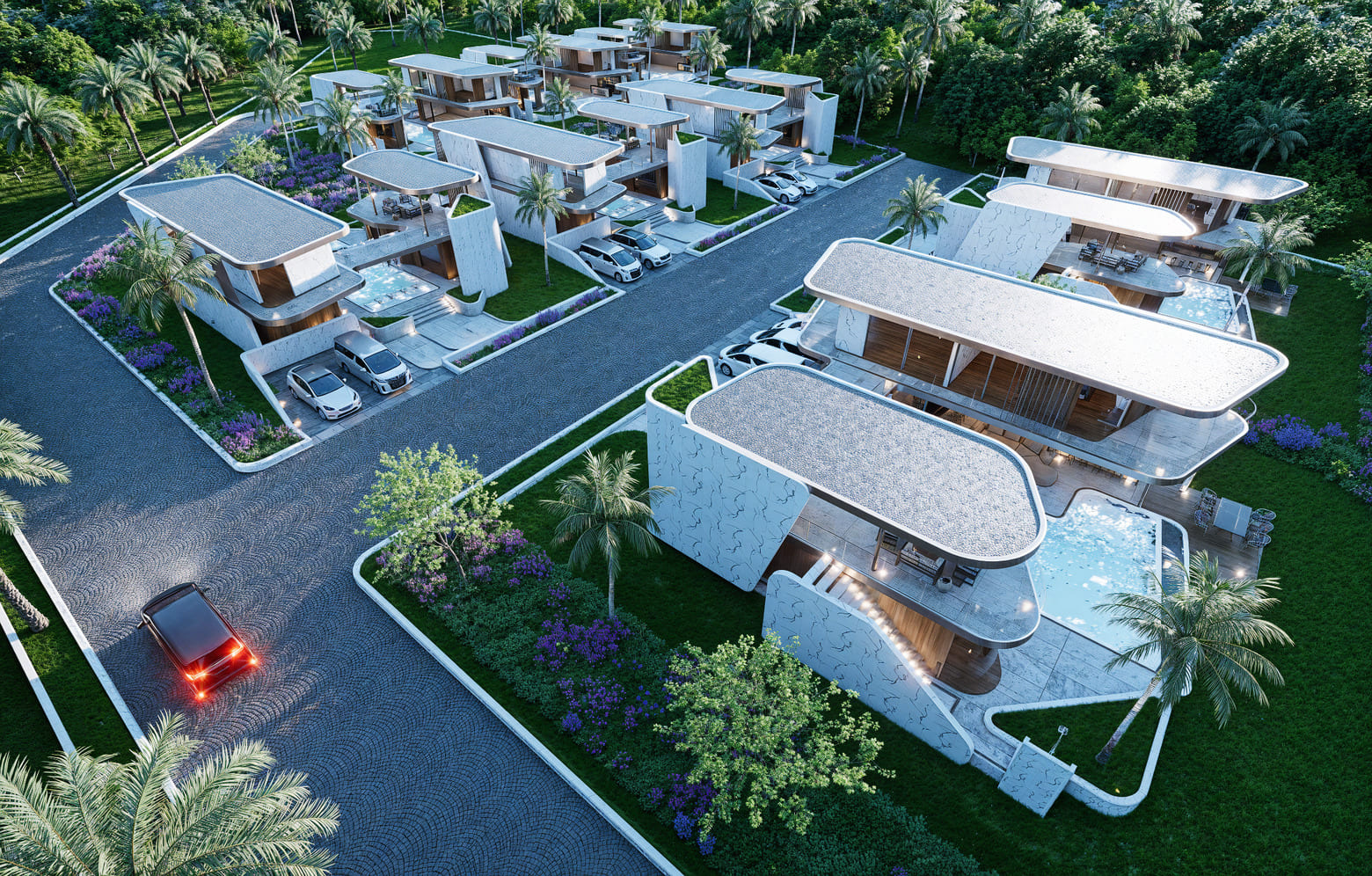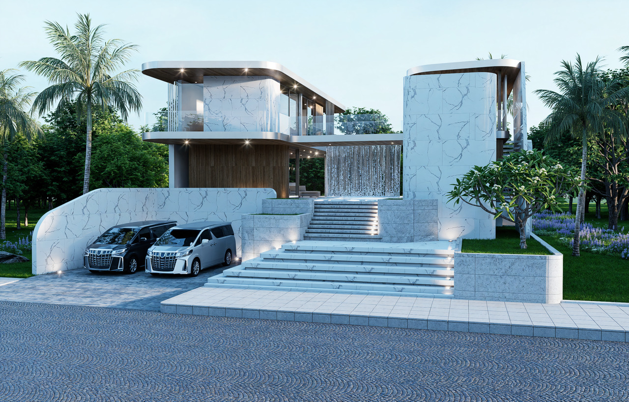 The exterior design features natural stone, marble, and concrete finishes combined with lush tropical landscaping. A private 4×15-meter swimming pool, waterfall fountain, and multiple terraces ensure both privacy and style. With layouts ranging from 449 sqm to over 616 sqm, the villas provide ample living space and parking for 2 to 3 cars.