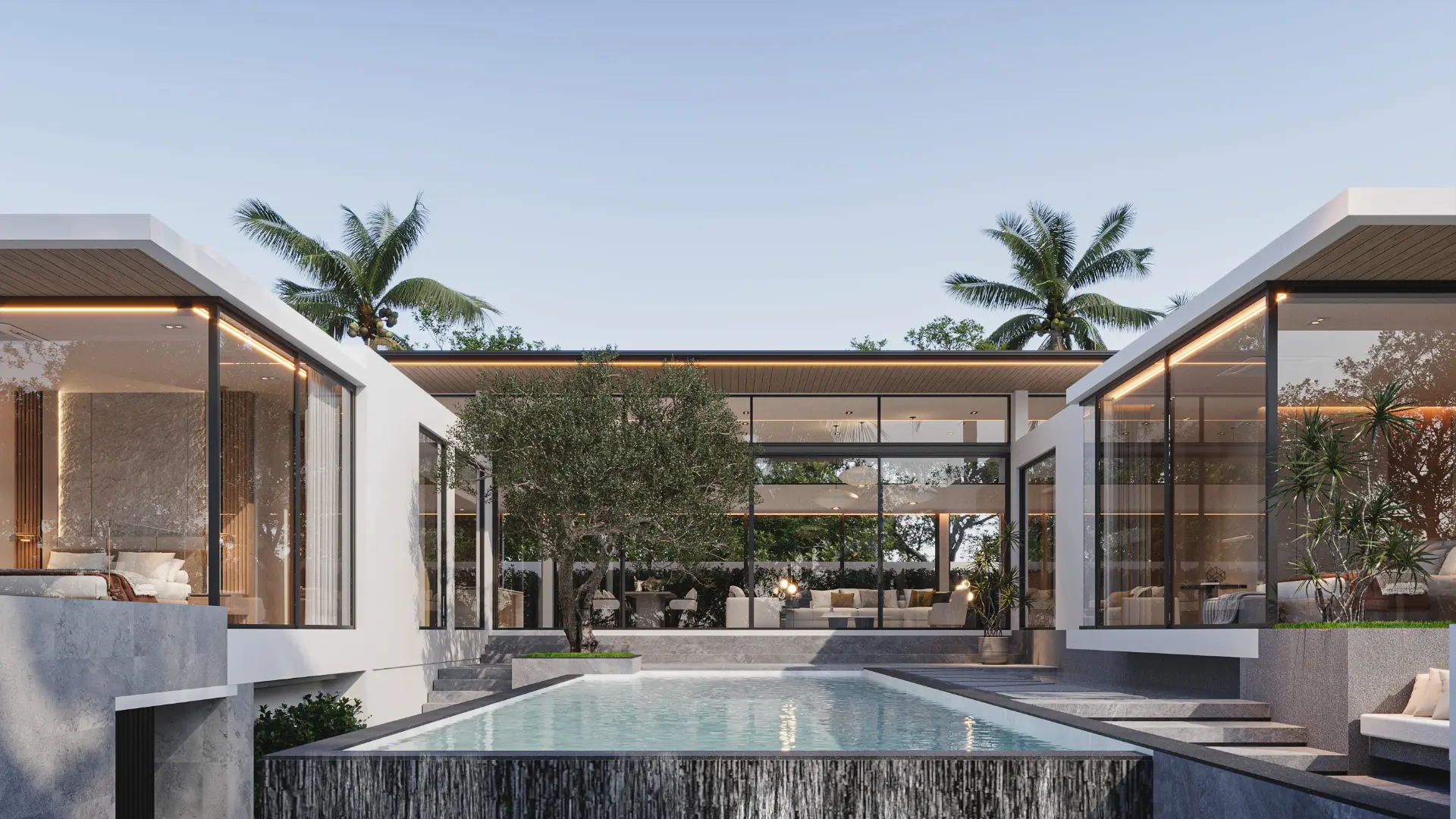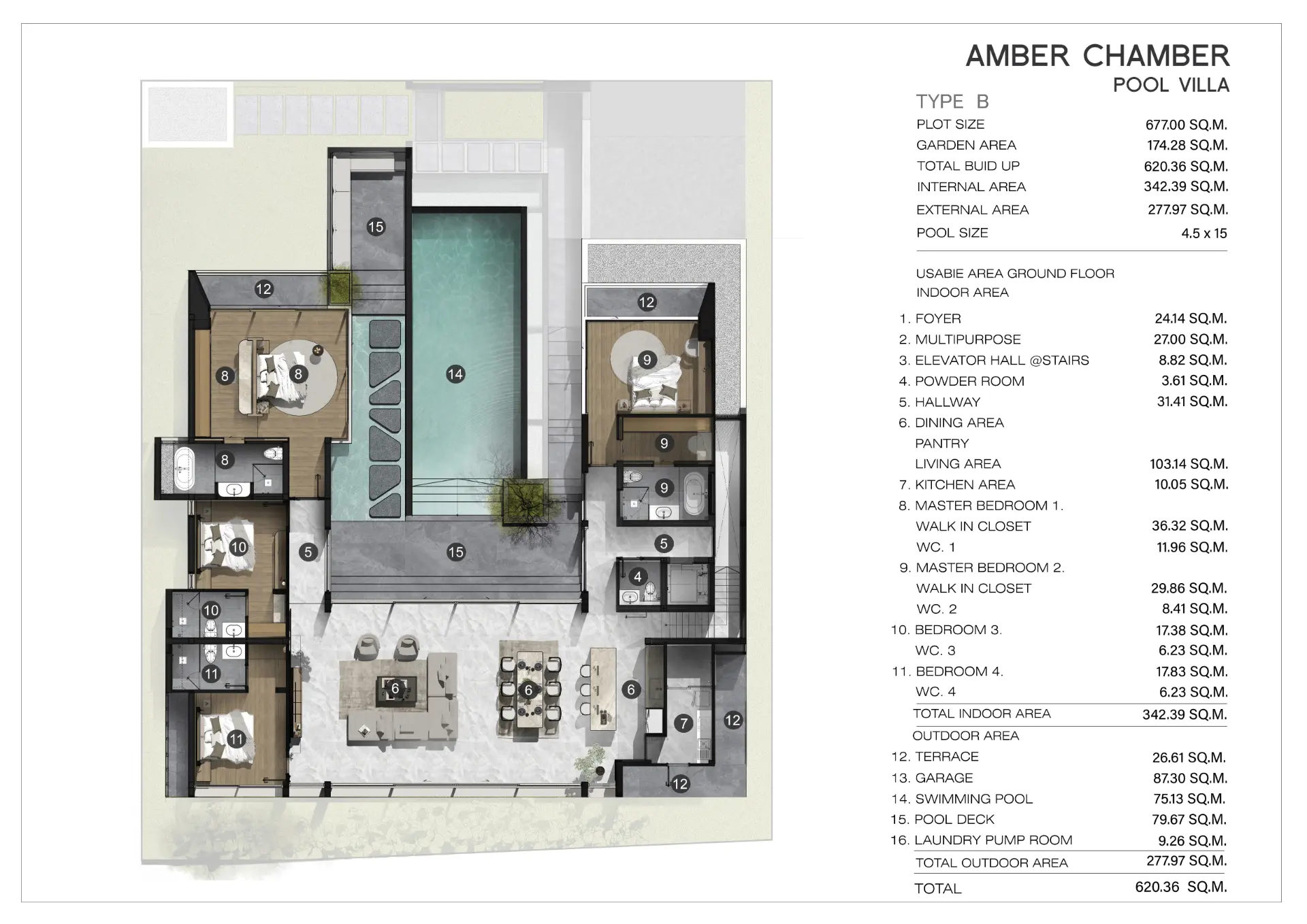 Amber Bliss spans a generous total area of 677 sq.m, featuring an exceptional layout that includes four luxurious bedrooms, four bathrooms, and expansive indoor and outdoor living areas. The villa also includes a sunken living area, a signature element that enhances relaxation and social connection. Large glass facades open toward lush greenery and a shimmering private swimming pool, ensuring every moment feels connected to nature.