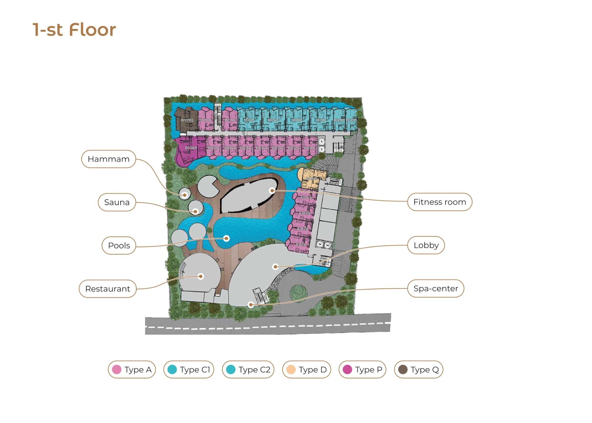 Inside Aura Condominium, residents enjoy first-class amenities that create a true resort feel. Start your day with a workout in the fully equipped fitness room — whether you prefer strength training, cardio, or yoga, there’s a space for it. Unwind afterward in the hammam, Finnish or Turkish saunas, or the luxury spa center. Three swimming pools, zoned for privacy, offer space to relax or cool off under the Phuket sun. Landscaped gardens and enhanced soundproofing add to the sense of privacy and tranquility throughout the development.