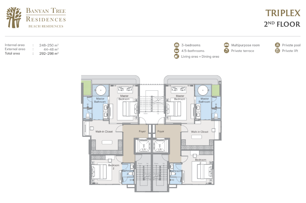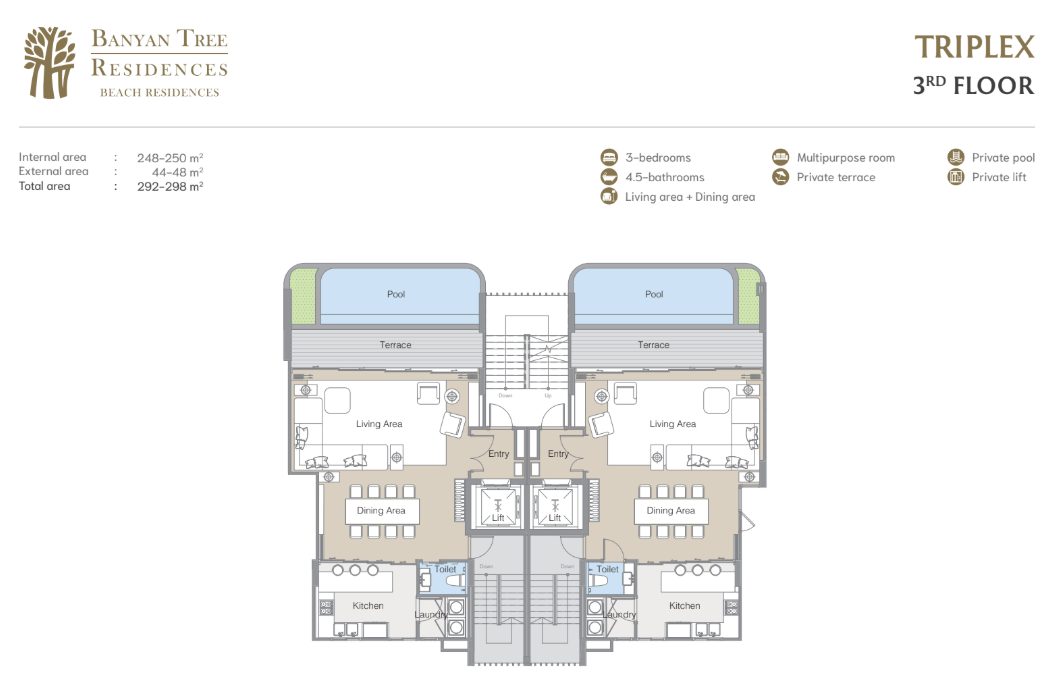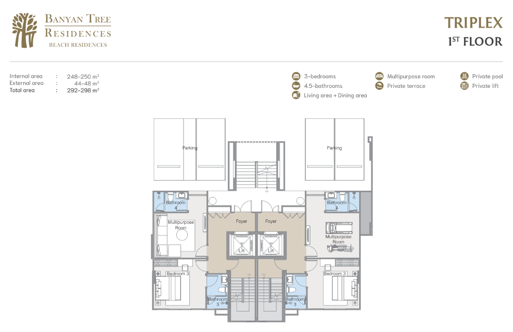 The Triplex condominium at Banyan Tree Beach Residences Varuna is thoughtfully designed over three generous floors, encompassing 292 square meters of refined living space. With 3 spacious bedrooms and 3 well-appointed bathrooms, this residence provides ample room for both privacy and entertainment, making it an ideal choice for families, holiday home seekers, or discerning investors.