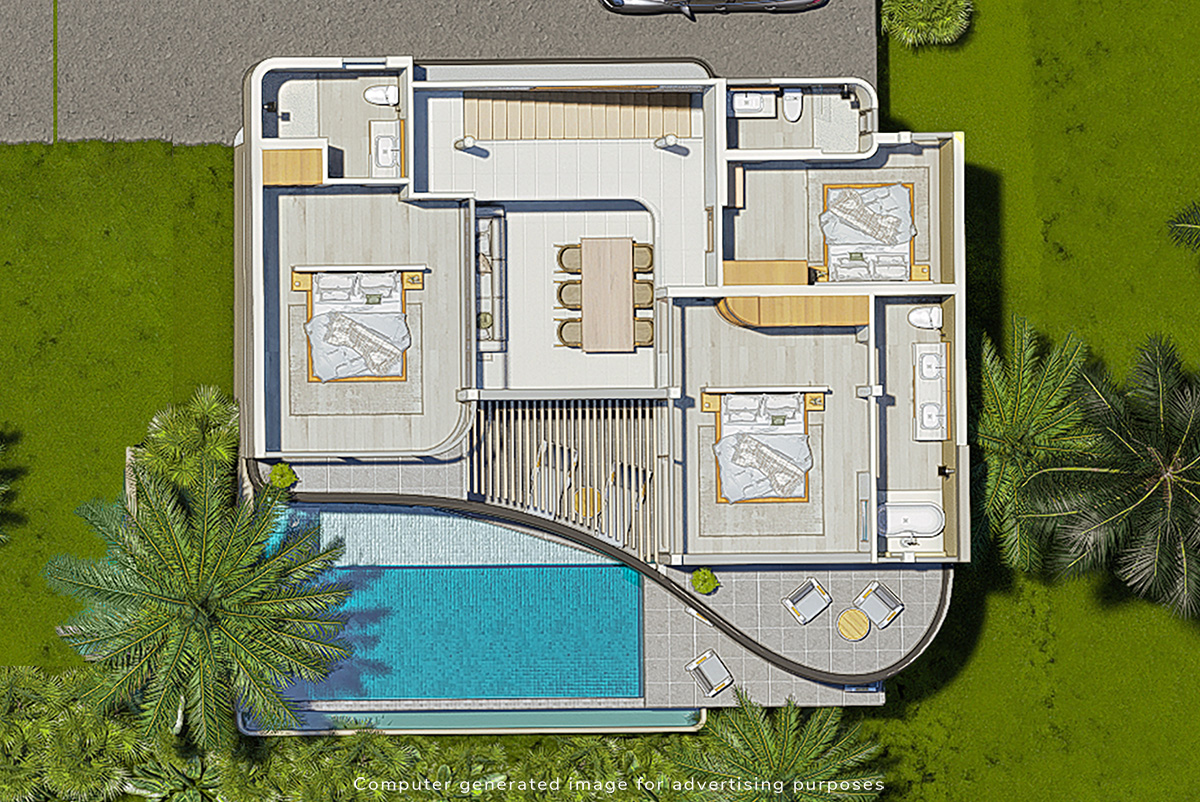 The villas comprise three spacious bedrooms, each with an ensuite bathroom, ensuring comfort and privacy for all residents and guests. Each bedroom is thoughtfully crafted to provide a serene retreat, complete with modern furnishings and decor that reflect the island’s natural beauty.