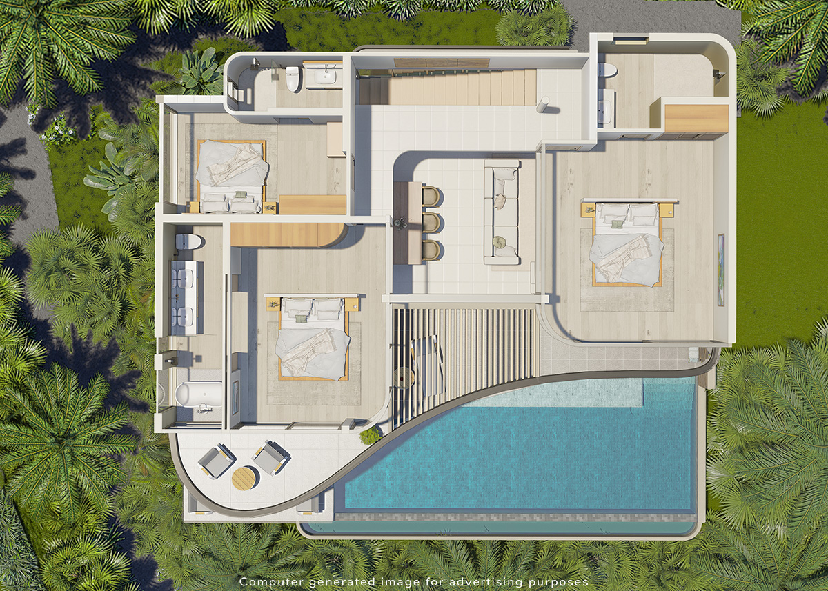 The villas offer flexible layouts, comprising 3 to 4 spacious bedrooms and 4 to 5 elegantly designed bathrooms, ensuring comfort and privacy for all residents and guests. Each bedroom is thoughtfully crafted to provide a serene retreat, complete with modern furnishings and decor that reflect the island’s natural beauty.