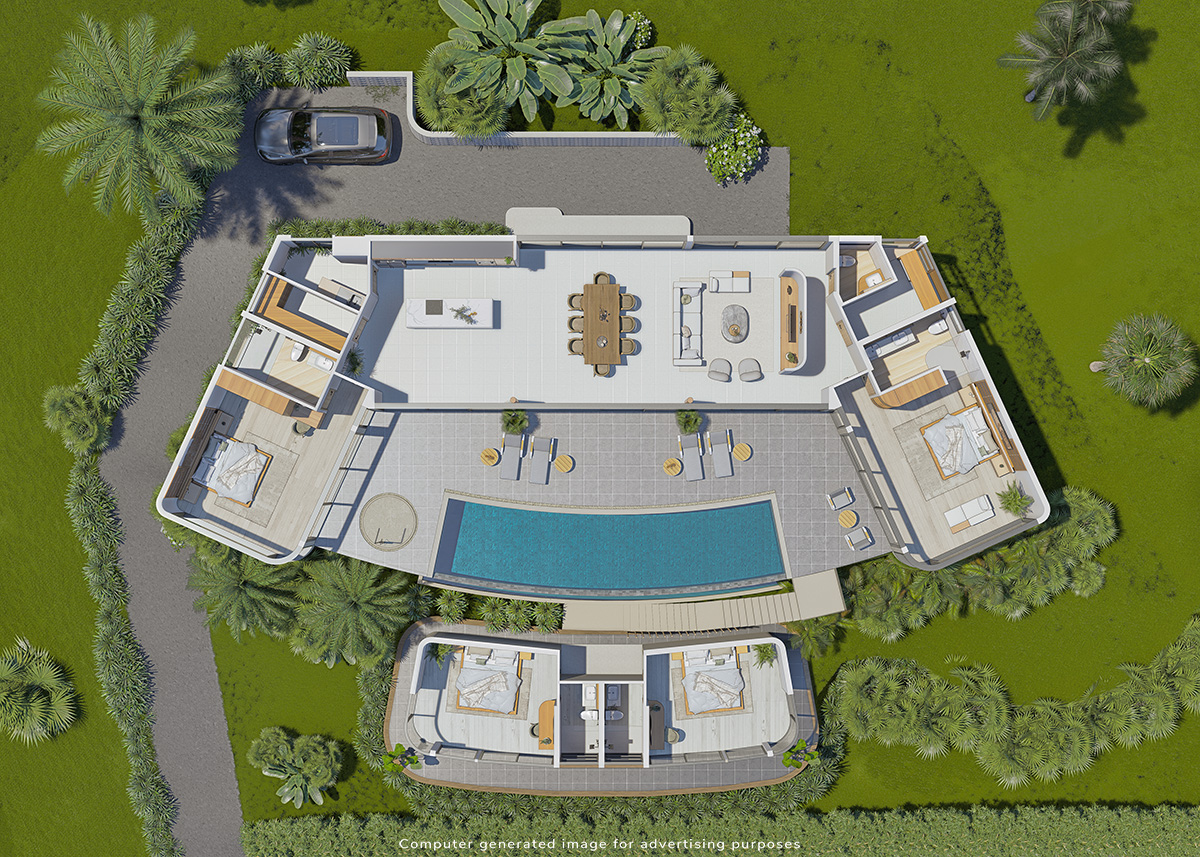 The villa comprises four spacious bedrooms and five elegantly designed bathrooms, ensuring comfort and privacy for all residents and guests. Each bedroom is thoughtfully crafted to provide a serene retreat, complete with modern furnishings and decor that reflect the island’s natural beauty.