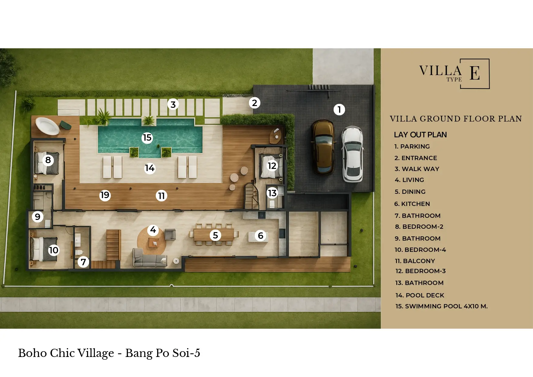 Villa E enjoys a premium location inside Boho Chic Village, offering privacy while remaining close to shared community features. Residents have easy access to landscaped walkways, recreational zones, and social spaces that encourage a sense of community and connection.