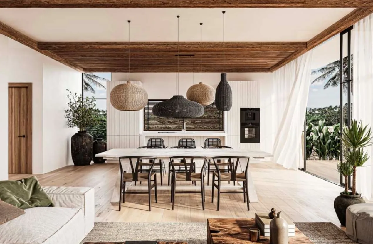 Each Chandra Villas Bophut property includes spacious living areas that promote relaxation and socialization. The open-plan living room flows seamlessly into the dining and kitchen areas, creating a sense of connectivity. The floor-to-ceiling windows and sliding doors enhance the feeling of openness, letting in ample natural light while also offering spectacular views. The living spaces are perfect for both quiet evenings and entertaining guests.