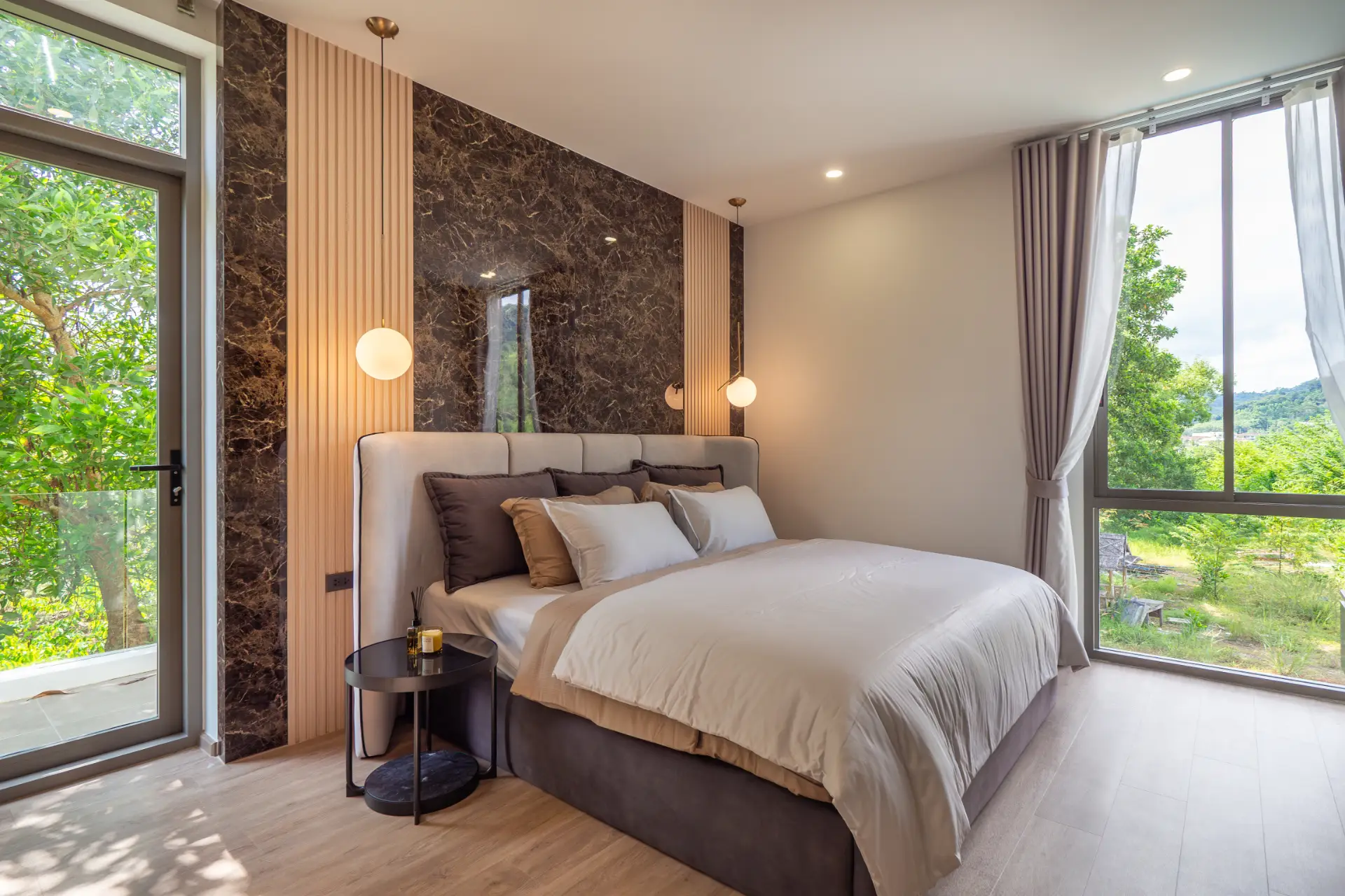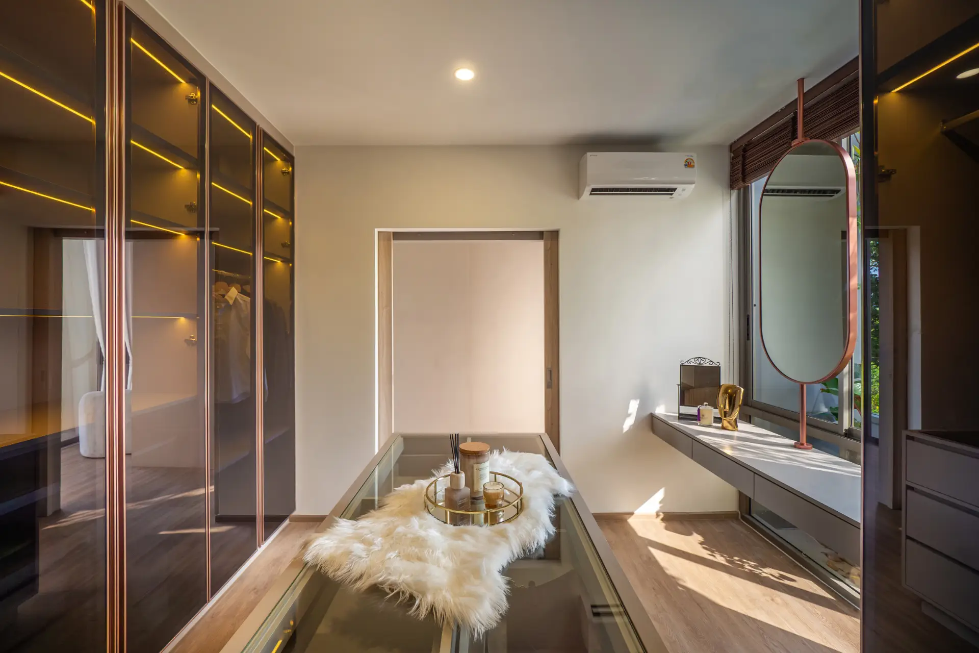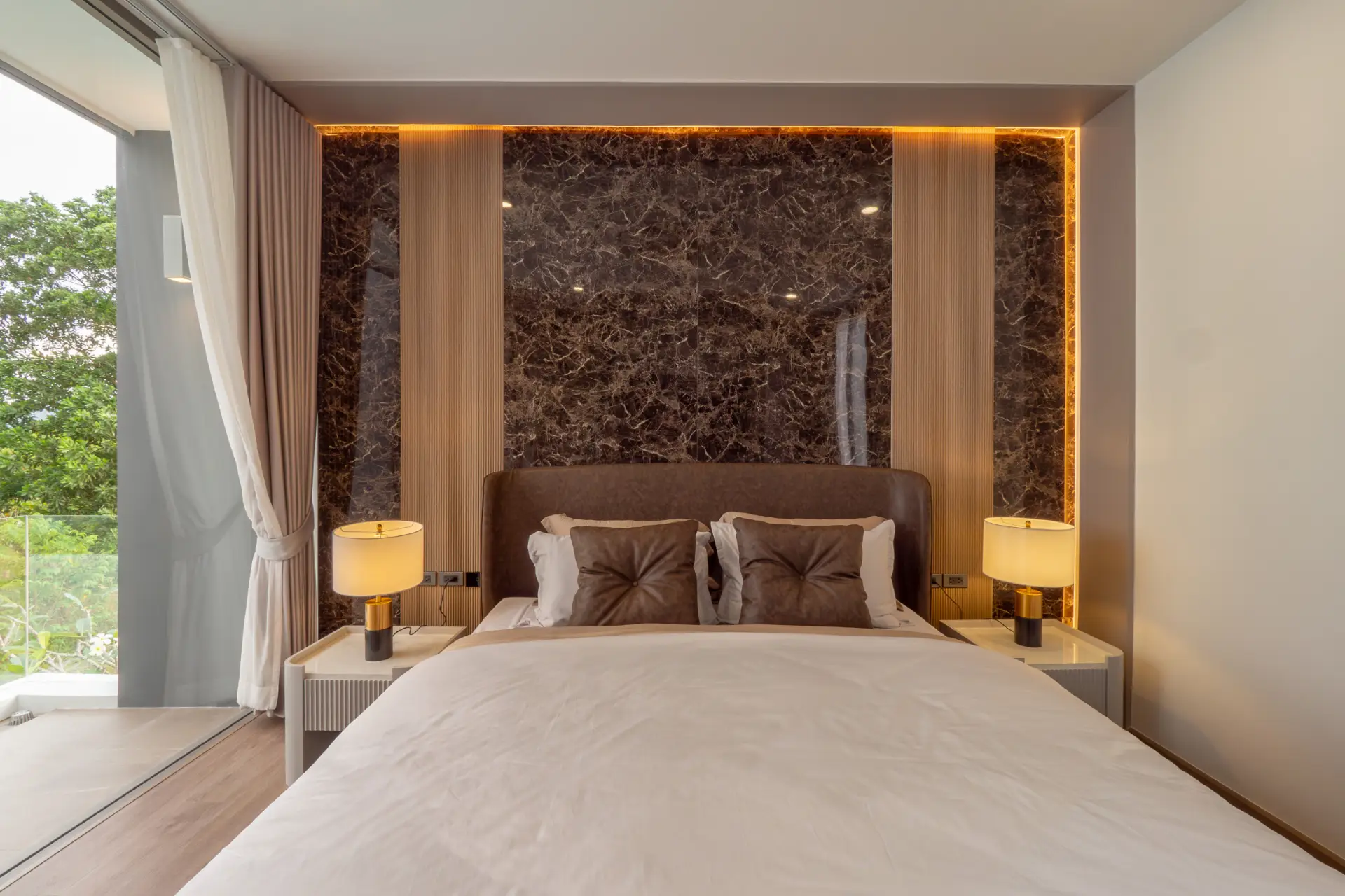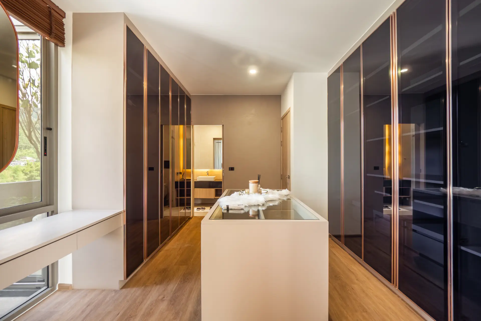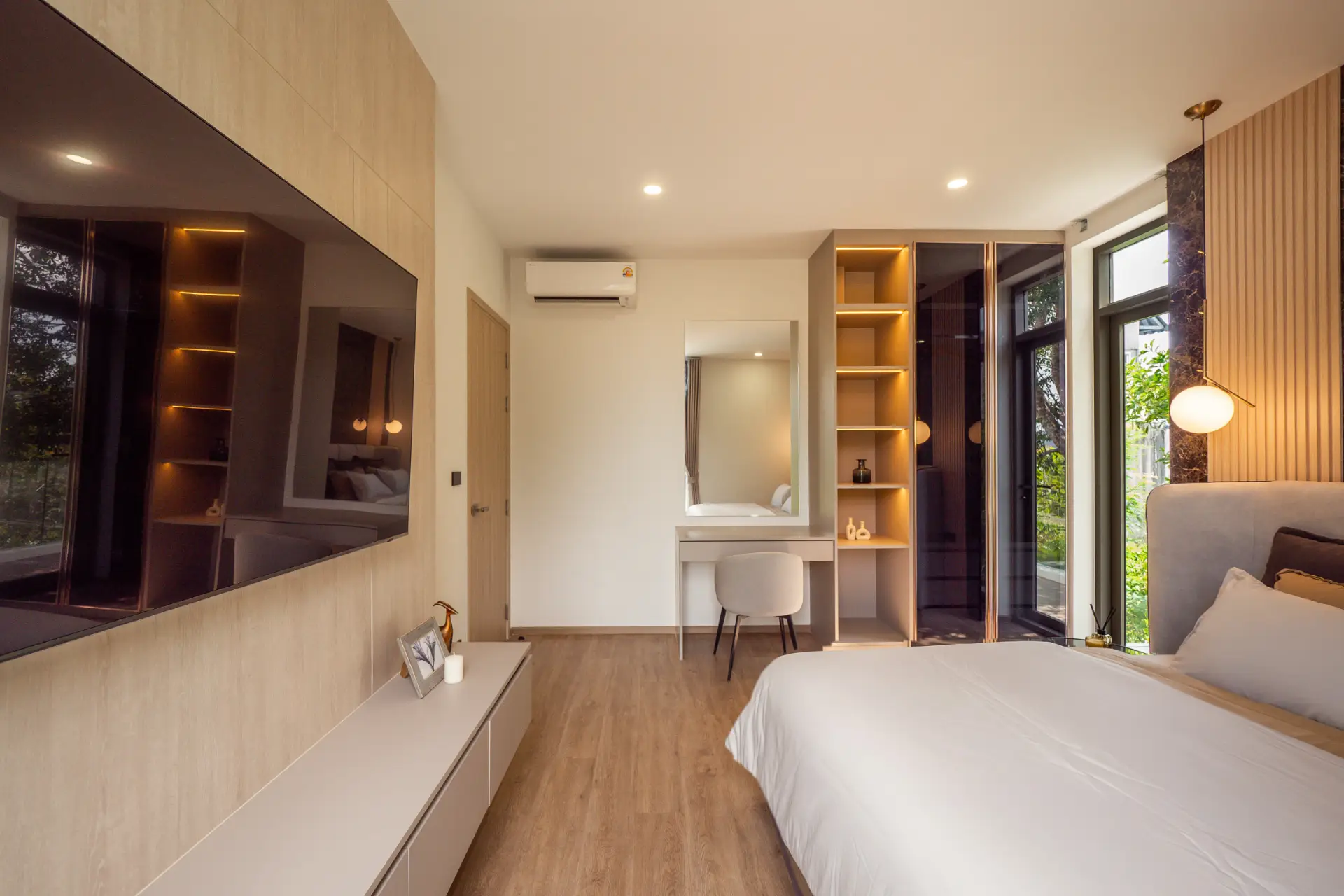 The second floor of each villa at D’Chateau Kathu is dedicated to elevated comfort and personal retreat. The master bedroom is exceptionally spacious, offering absolute privacy and a serene ambiance. It includes a walk-in closet, a lavish ensuite bathroom, and a jacuzzi bathtub, providing a spa-like experience at home.