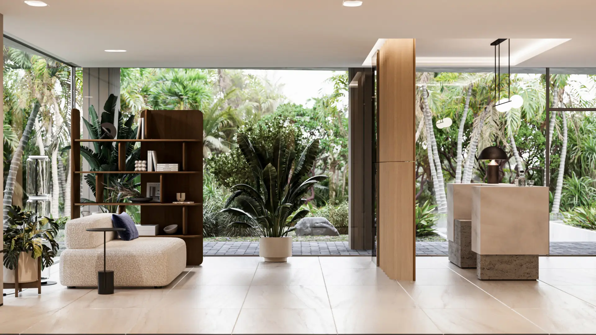The atmosphere is calm, stylish, and richly tropical.