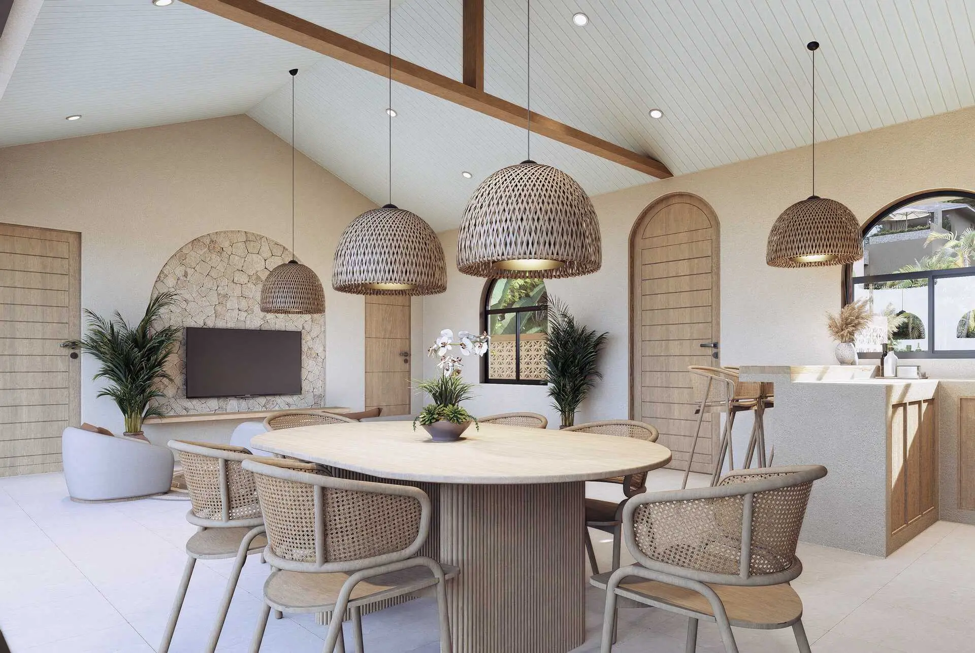 The villa features a large open-plan living and dining area that opens directly onto the pool terrace through wide sliding glass doors. This creates a seamless indoor–outdoor flow, ideal for entertaining, family gatherings, or relaxing in a tropical environment.