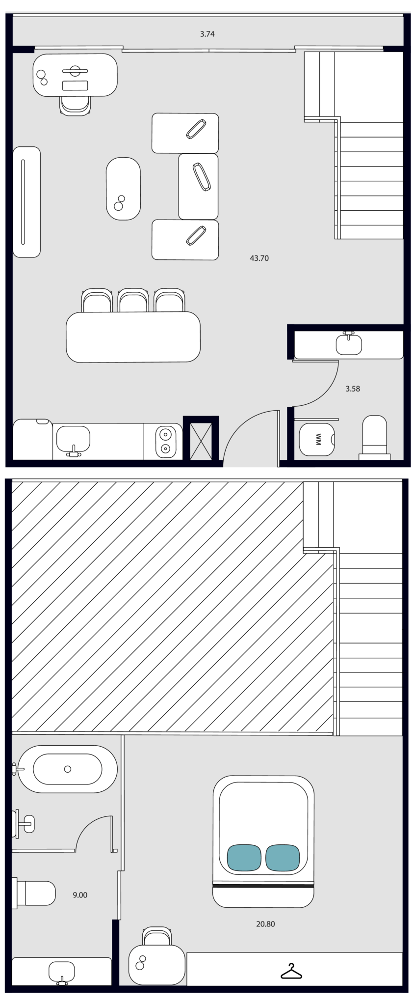 The 1BR Duplex is a modern sanctuary that maximizes functionality across two floors. The lower level features an open-concept living and dining area, complemented by floor-to-ceiling windows that fill the space with natural light. The stylish European kitchen comes fully equipped, perfect for preparing meals at home with ease.
