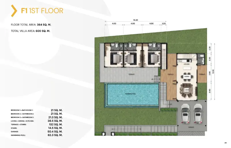 The Hightone Seaview Villas – 5BR Seaview is among the largest layouts within the project, offering approximately 580–600 sqm of total built-up area across three spacious levels.