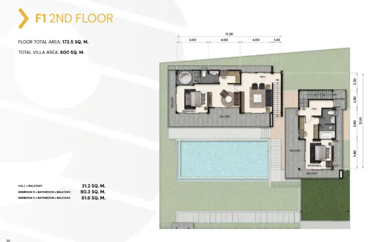 Bedrooms are generously sized, with some master suites exceeding 70–80 sqm including bathroom and balcony areas.